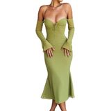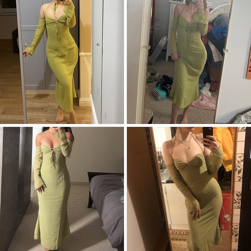 ZGMYC Women's Sexy Off Shoulder Halter Midi Dress Bodycon Elegant Tie Up Flare Long Sleeve Fishtail Cocktail Party Dresses