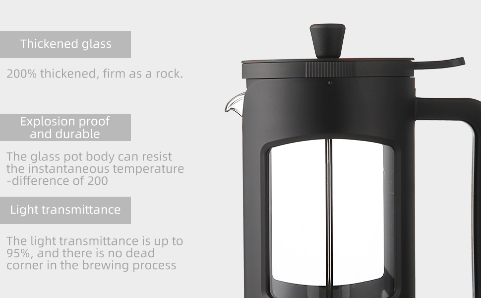 ☕️【مواد متينة】جميع مواد ماكينة الضغط الفرنسية الخاصة بنا هي مواد فردية خالية من مادة BPA، والتي تتجاوز متطلبات جودة الطعام والشراب. يمكن لإبريق زجاج البورسليكات الزجاجي السميك المقاوم للحرارة من SIXAQUAE أن يحافظ على الماء ساخنًا أثناء عملية التخمير ويطيل عمر المنتج.