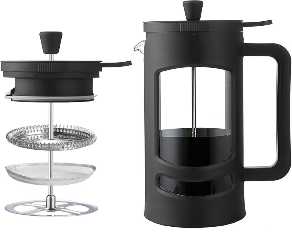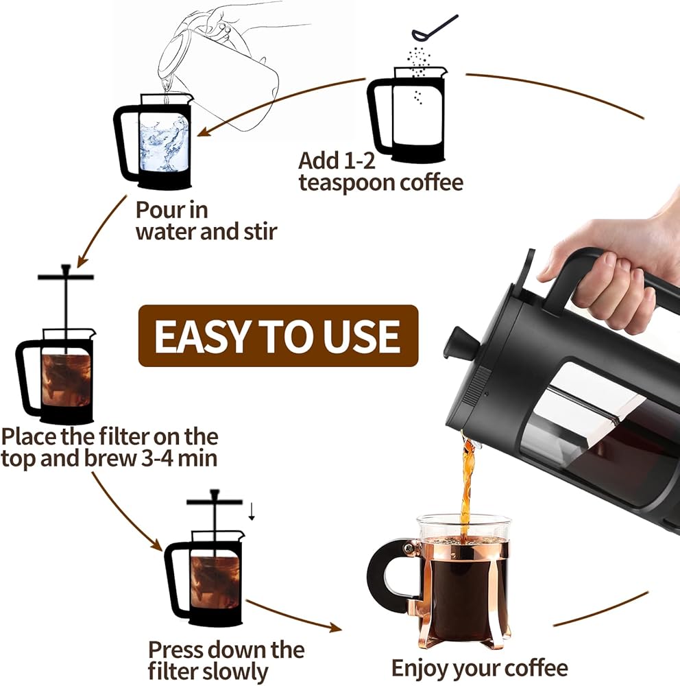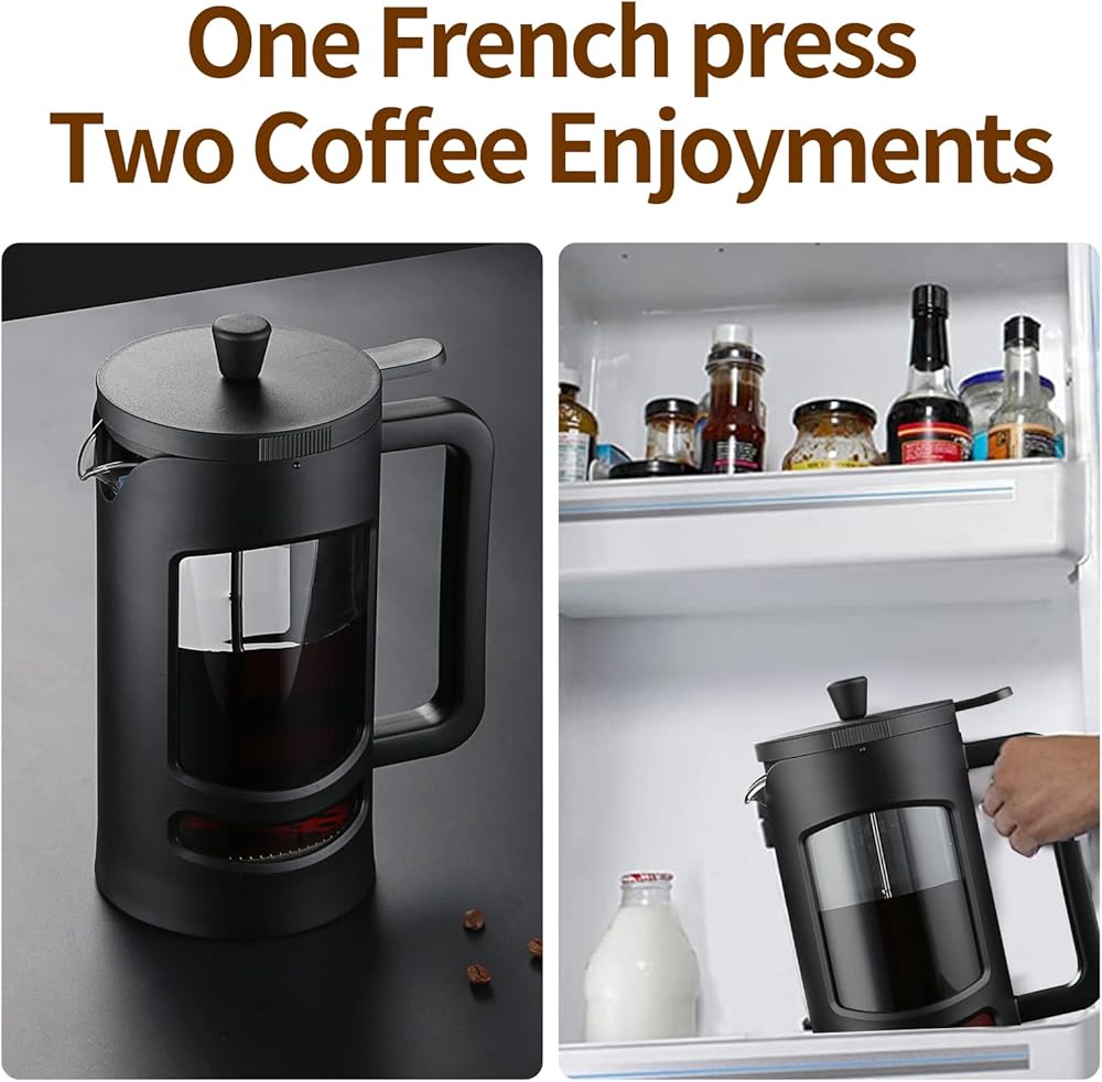 ☕️【المشروب البارد والعصارة الفرنسية】يمكن للعصارة الفرنسية الخاصة بنا أيضًا صنع القهوة الباردة، كل ما عليك فعله هو وضع مسحوق القهوة في الجزء السفلي من الضغط الفرنسي، ثم صب الماء والضغط بلطف على ورق الفلتر، ثم قم بتدوير الغطاء لعمل القهوة الباردة. كامل داخل الصحافة الفرنسية محكم الإغلاق ووضع الصحافة الفرنسية في الثلاجة