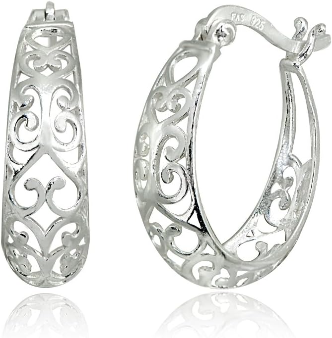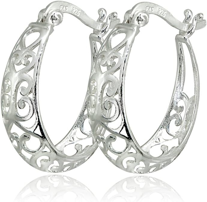High polished earrings display filigree oval hoops with click-top closures. The hoops are crafted of sterling silver and are nickel free.