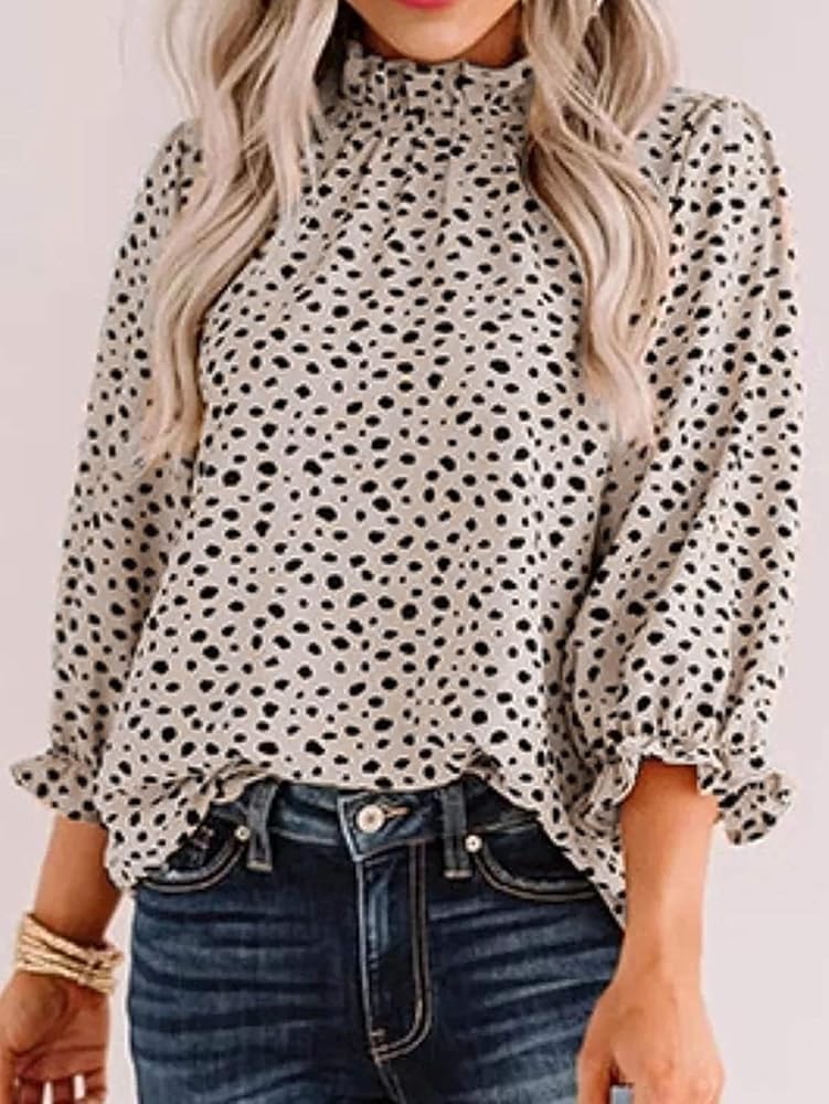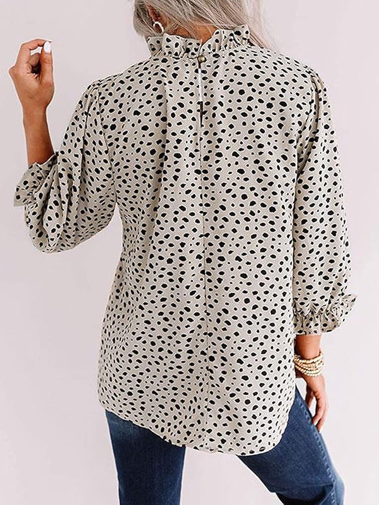 - ياقة واقفة، مقاس عادي، بلوزة عصرية كاجوال بطباعة ليوبارد 3/4 كم برقبة مكشكشة للنساء والفتيات.