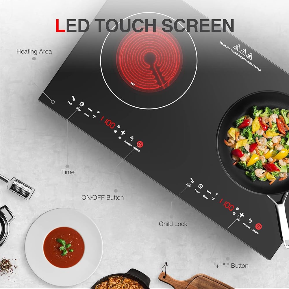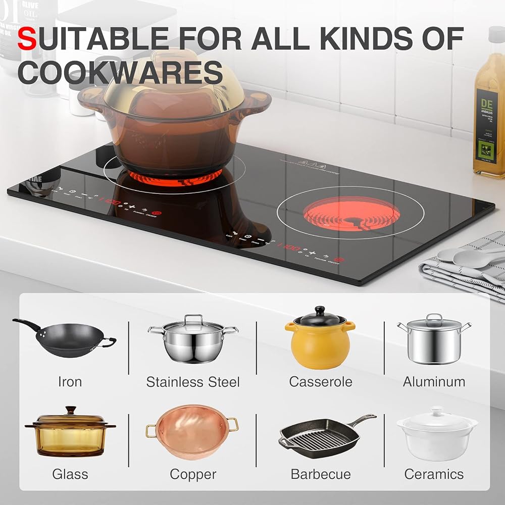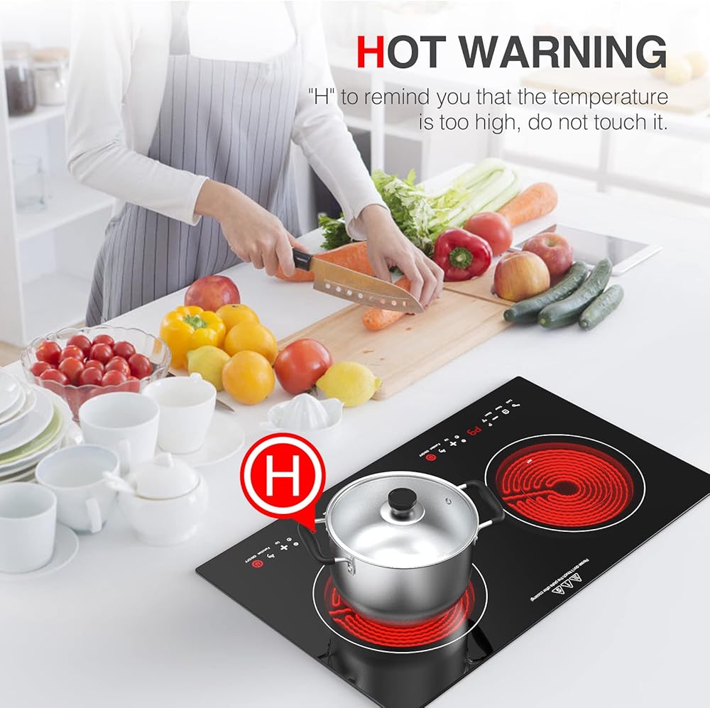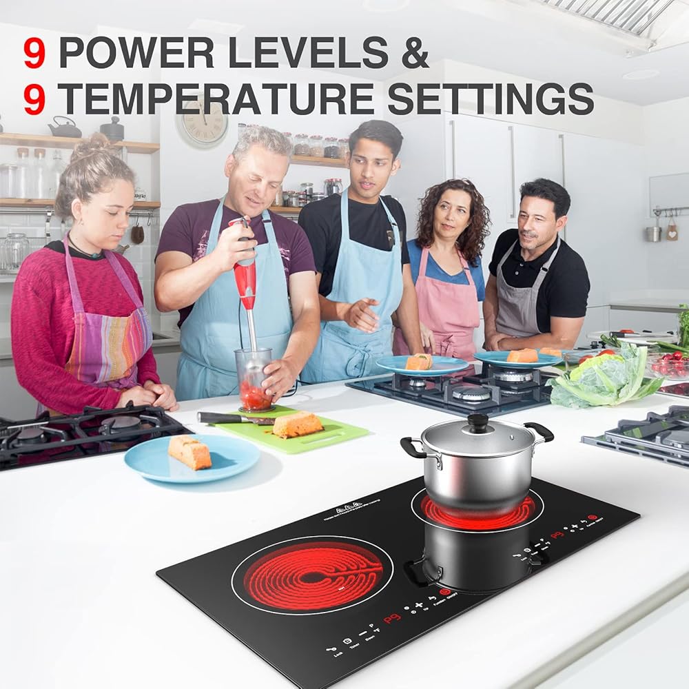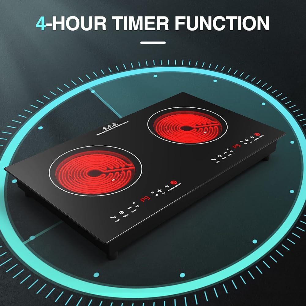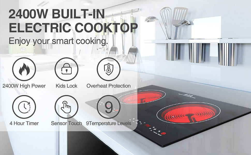 🍲【مناطق طهي قوية】الموقد الخزفي مقاس 24 بوصة مناسب لتيار متردد 120 فولت، مع عنصرين قويين للطهي المستقلين، الطاقة الإجمالية المقدرة 2400 واط (1200 واط + 1200 واط). يمكنك طهي أطباق مختلفة في نفس الوقت، بشكل أسرع وأكثر كفاءة في استخدام الطاقة.