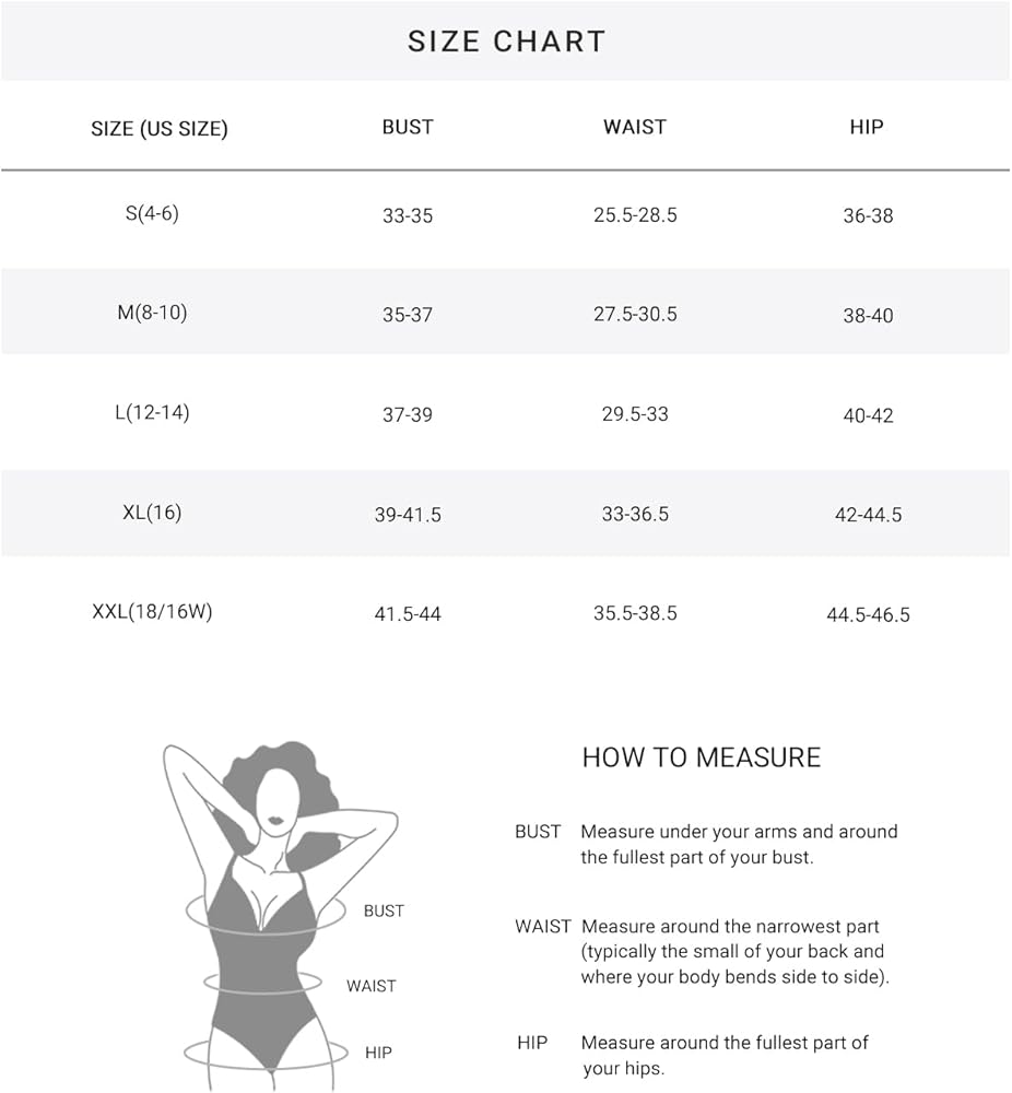 المقاس: لتحقيق المقاس المثالي، يرجى أولاً أخذ قياسات دقيقة ثم الرجوع إلى جدول المقاسات الخاص بنا، والذي تم تصميمه بعناية ليناسب تصميمات ملابس السباحة لدينا. المقاسات المتاحة هي: S (الولايات المتحدة 4-6)، M (الولايات المتحدة 8-10)، L (الولايات المتحدة 12-14)، XL (الولايات المتحدة 16)، XXL (الولايات المتحدة 18).