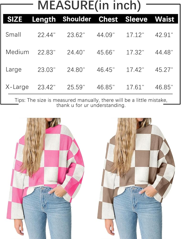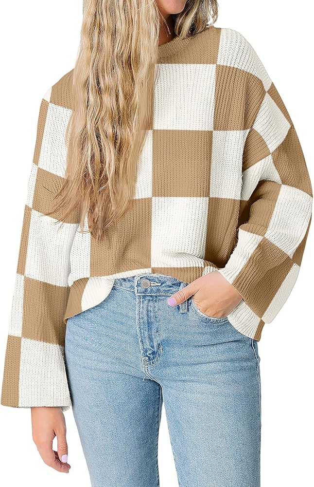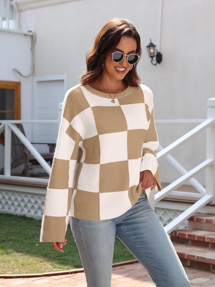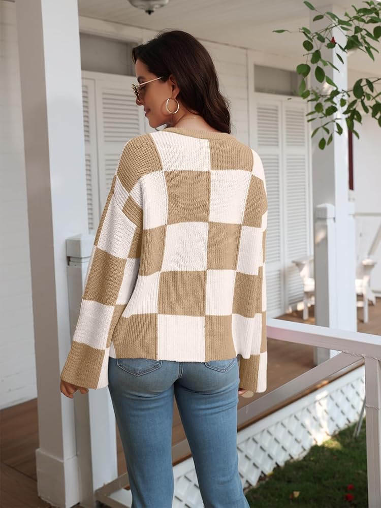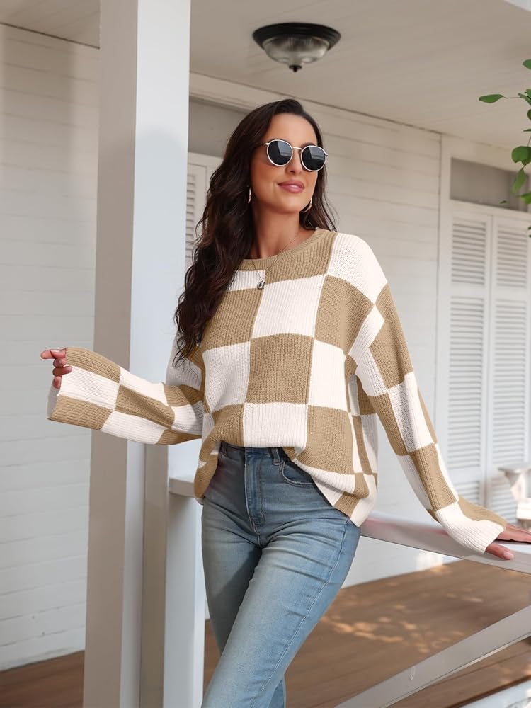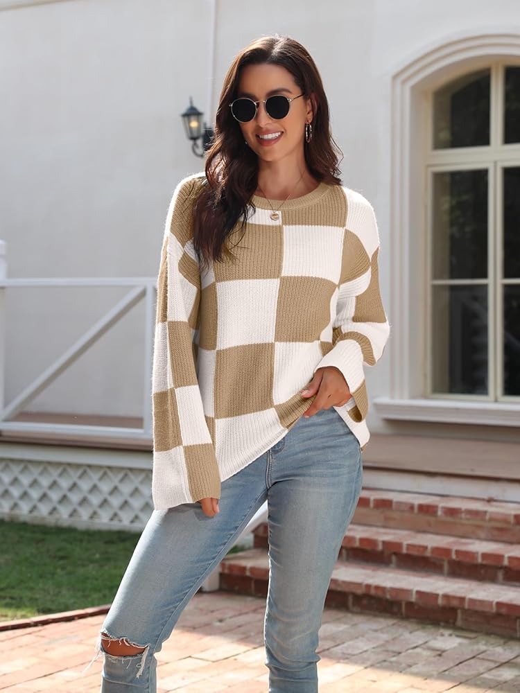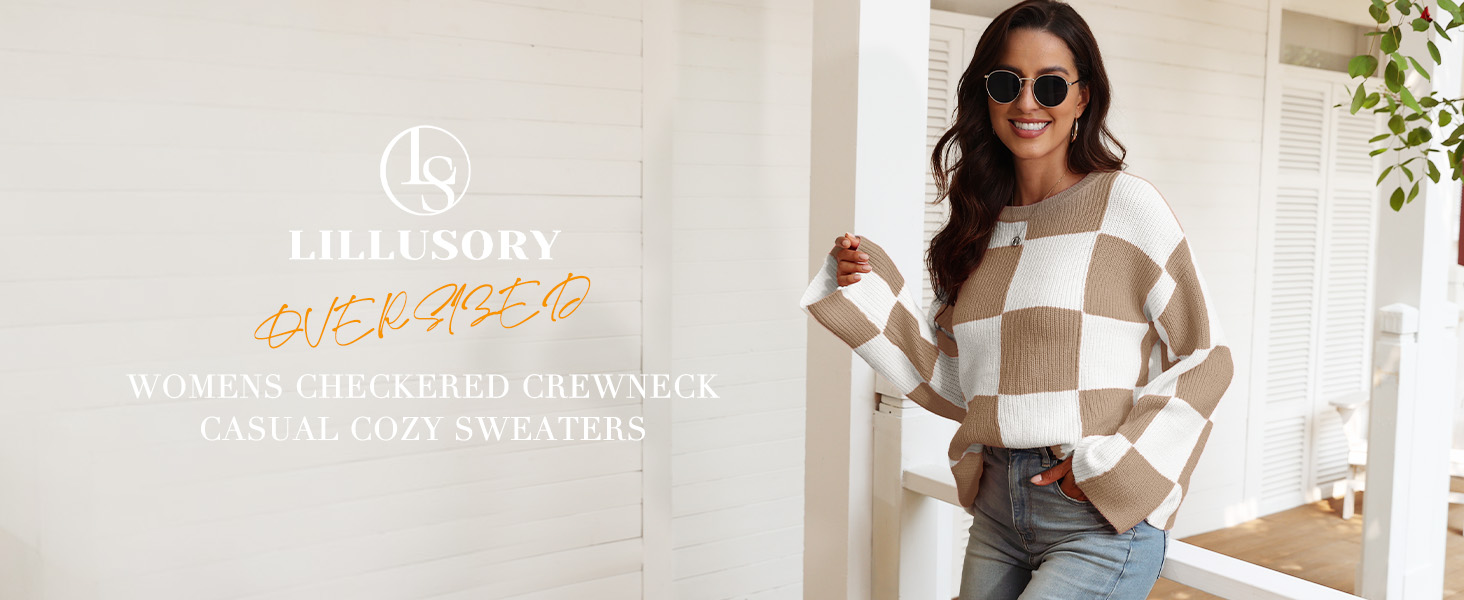 بلوفر نسائي من LILLUSORY موضة 2023 ذو مربعات وأكمام طويلة وفتحة رقبة مستديرة ومخطط كبير الحجم وسترات علوية غير رسمية
