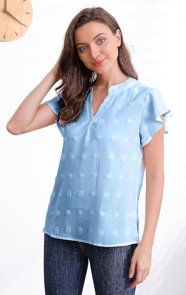تصميم قميص منقط سويسري: بلوزات قصيرة الأكمام للنساء مصممة بفتحة رقبة على شكل حرف V، وقماش منقط سويسري وأكمام مطوية مكشكشة. قميص نسائي برقبة على شكل حرف V وأكمام على شكل بتلات، هذه البلوزة الصيفية الكاجوال فريدة جدًا ومختلفة.