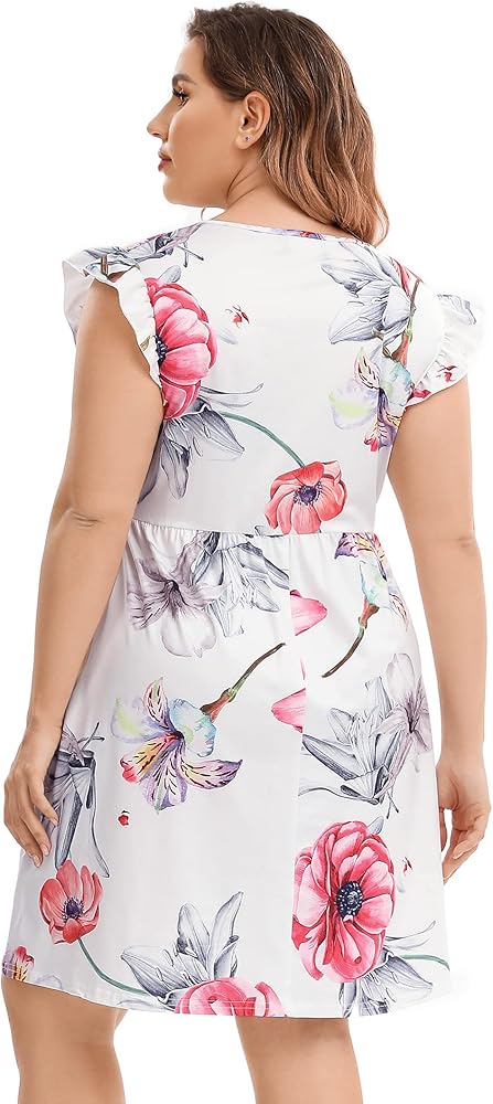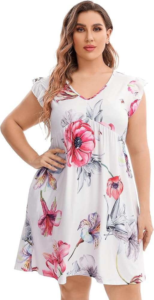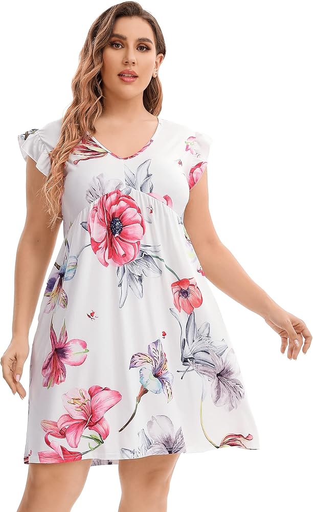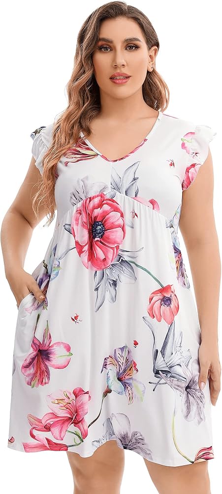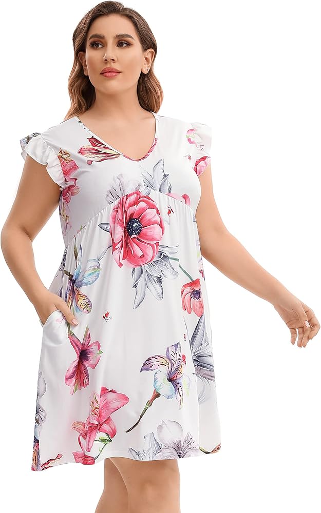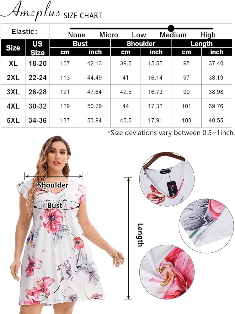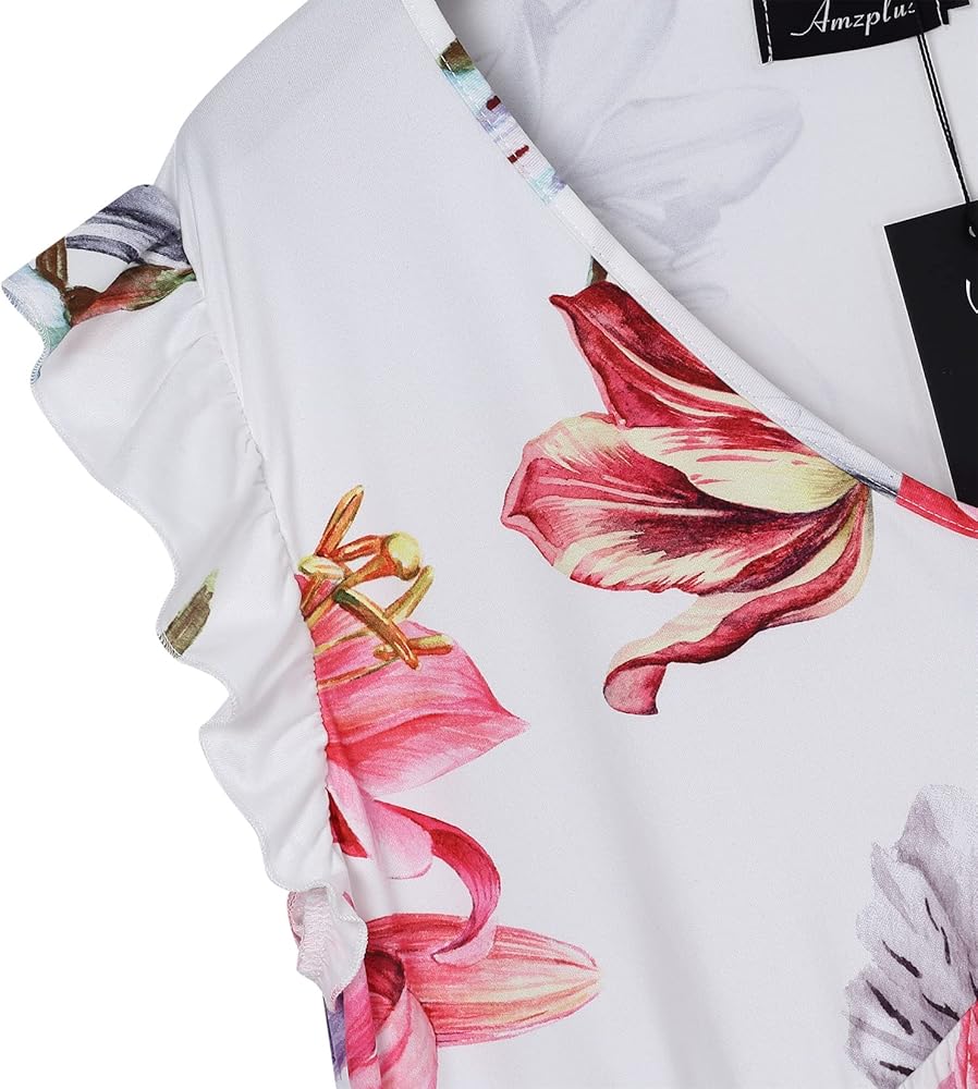 التصميم: يتميز هذا الفستان الصيفي القصير الأكمام للنساء ذوات المقاسات الكبيرة برقبة على شكل حرف V، وتصميم بأكمام مكشكشة، ولون ثابت، وطباعة زهرة وربطة عنق، وطول متوسط، وجيوب على كلا الجانبين، ومقاس فضفاض، ونمط كاجوال متأرجح. خمسة مقاسات: XL، 2XL، 3XL، 4XL، 5XL