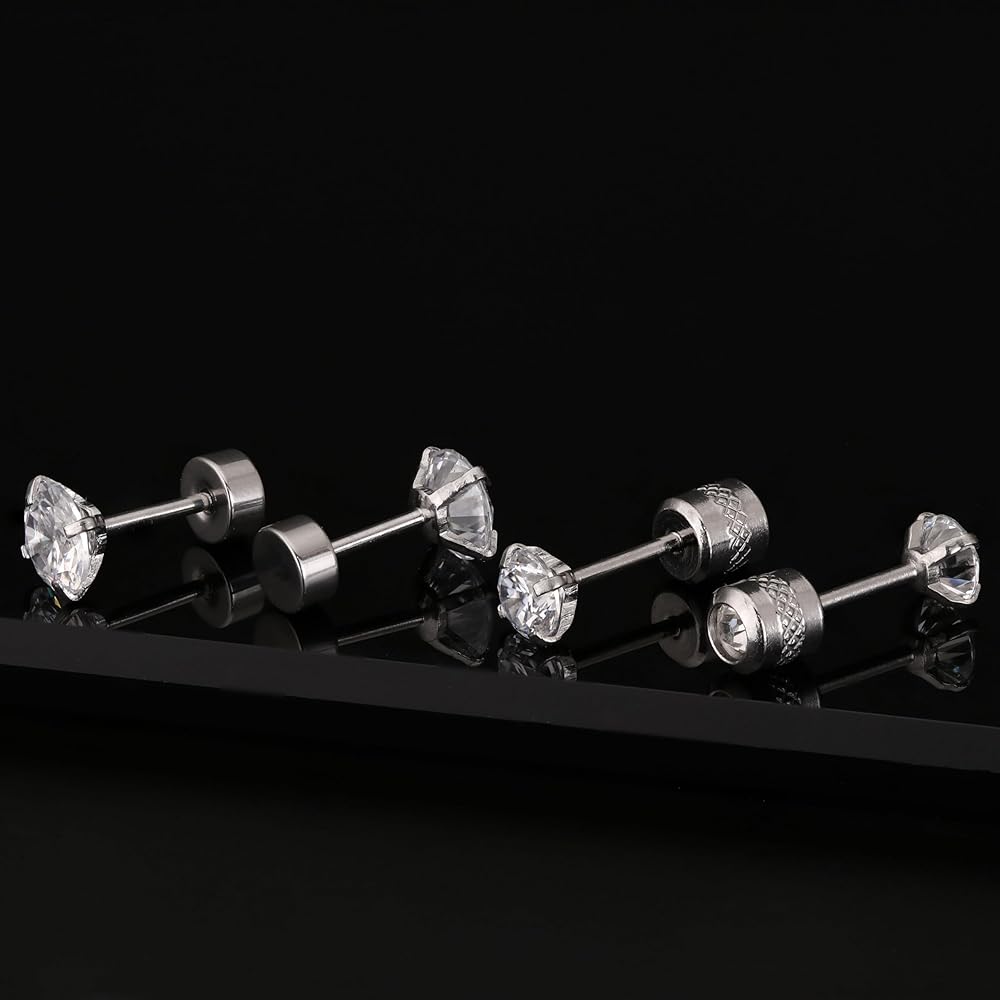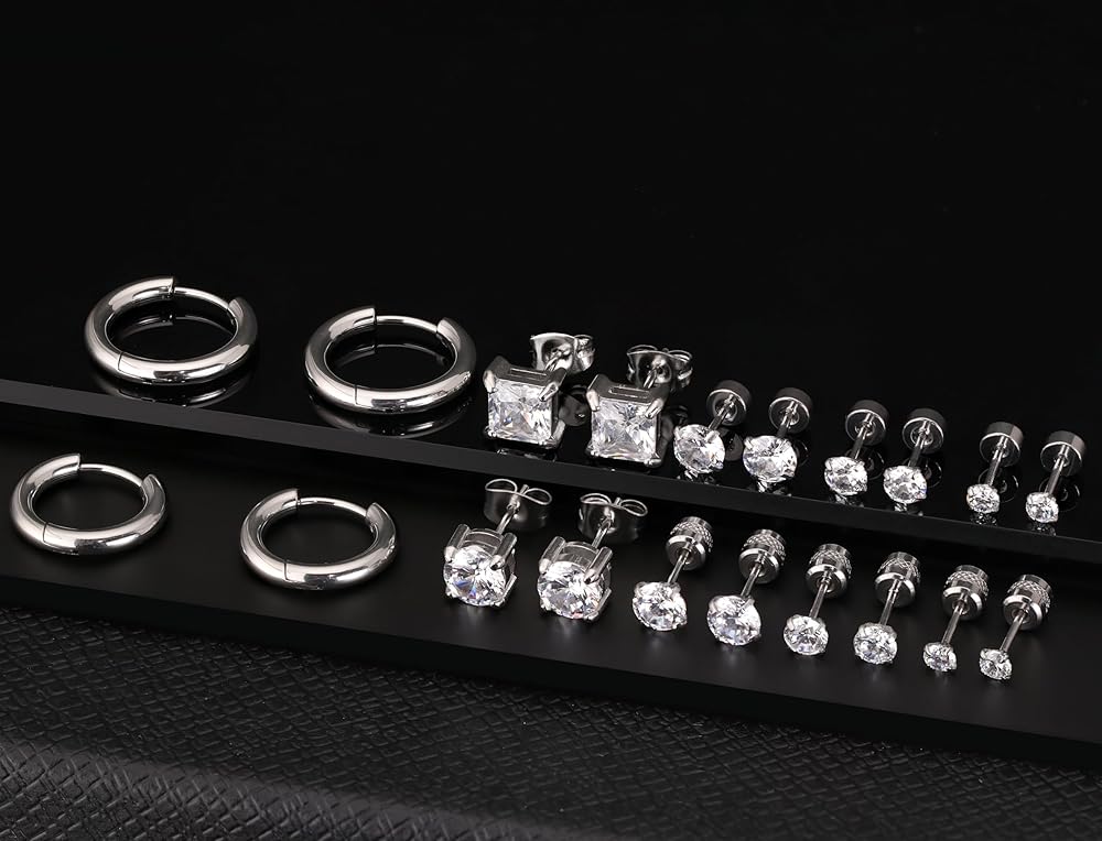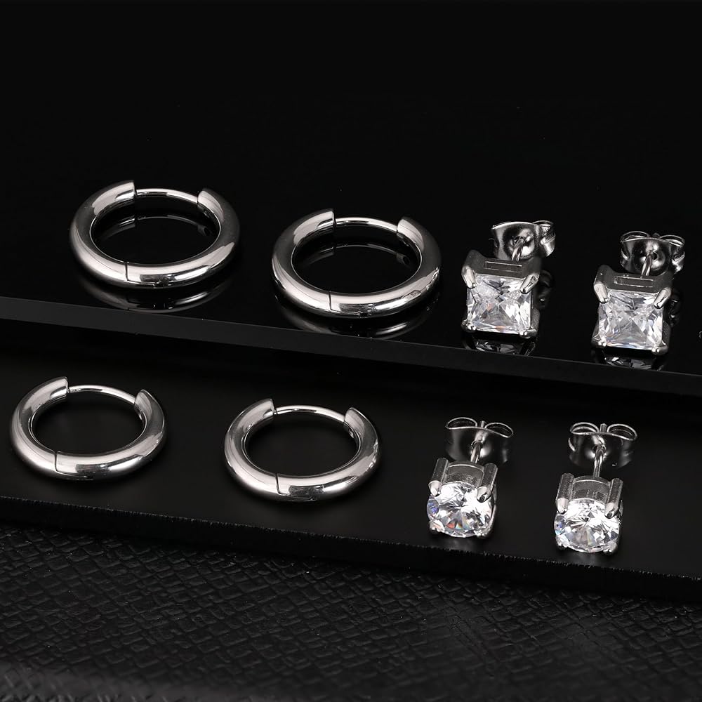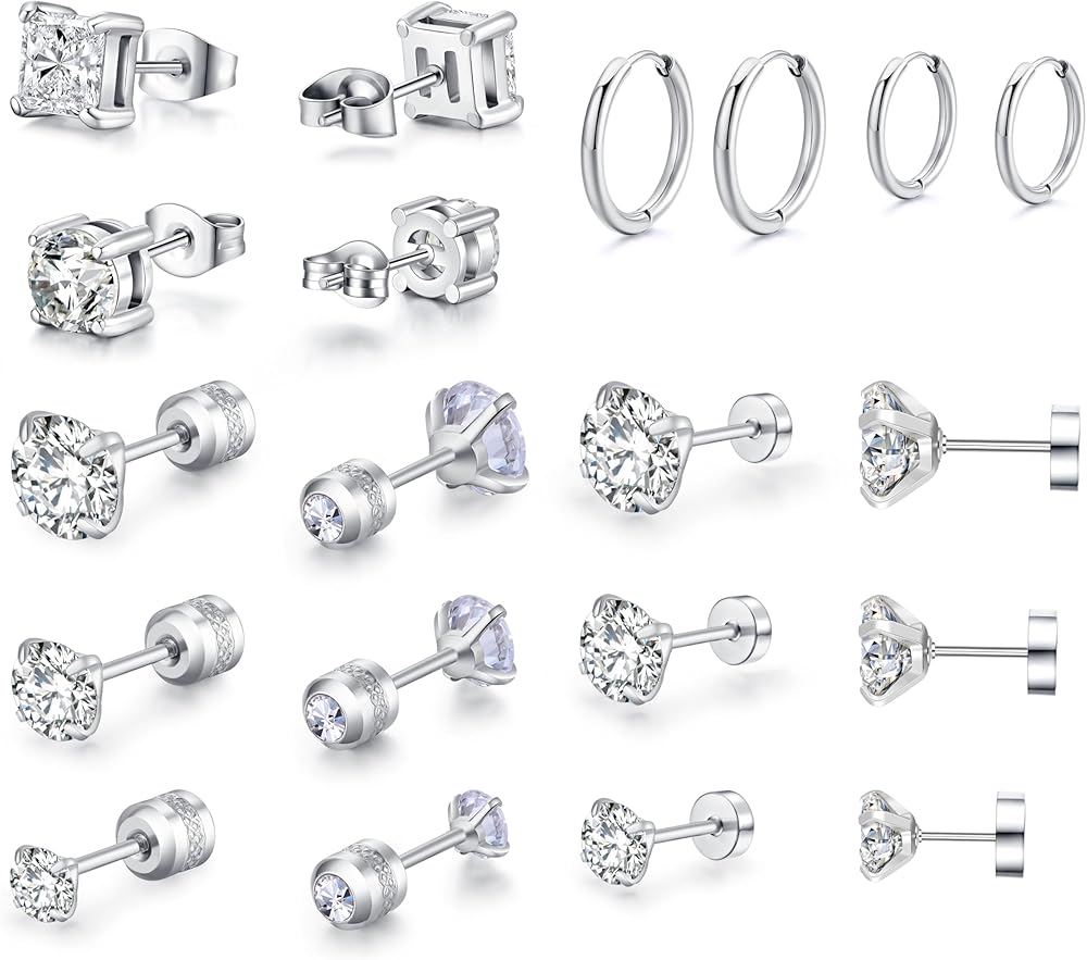 10 ازواج من الاقراط الفضية المصنوعة من الستانلس ستيل، مجموعة اقراط للرجال والنساء مع مرصعة بالزركونيا المكعب ومربع من الستانلس ستيل ومربع بحجر ابيض كريستالي