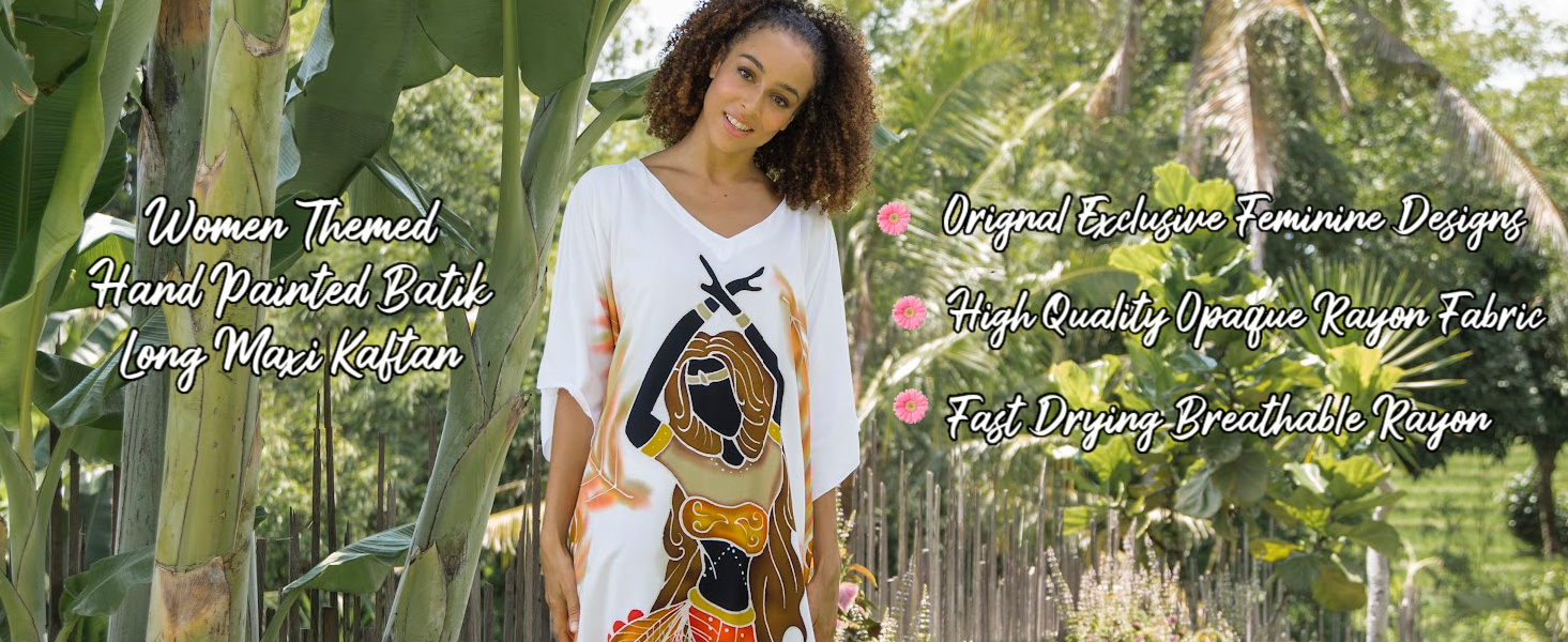 قفطان جميل بتصميم تمكين المرأة مرسومة يدوياً. احتفل بقوة المرأة في هذا الفستان الطويل المذهل، الذي رسمه حرفيون من بالي باستخدام تقنيات الباتيك التقليدية. تتميز بصورة ظلية مصممة بشكل فني لنساء بأذرع ممدودة إلى السماء، على خلفية بيضاء واضحة