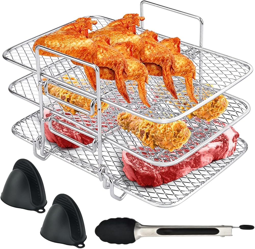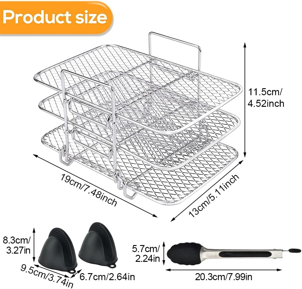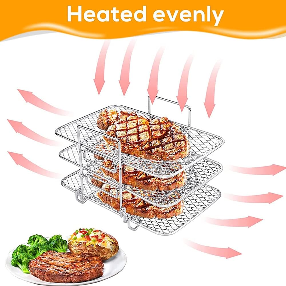 【مادة متينة】رف المقلاة الهوائية مصنوع من الستانلس ستيل السميك، مع شبكة محكمة تمنع الطعام من السقوط، تصميم منحني، لا تؤذي الوعاء.