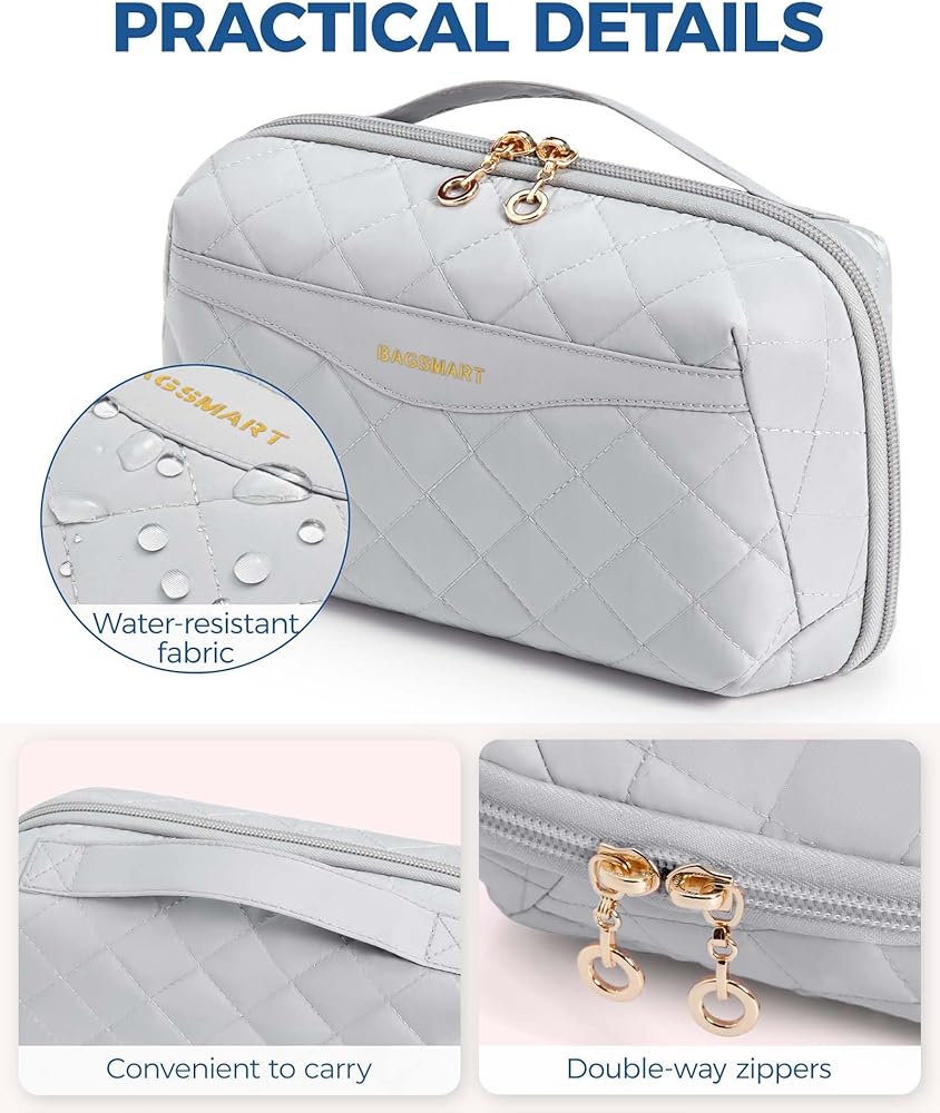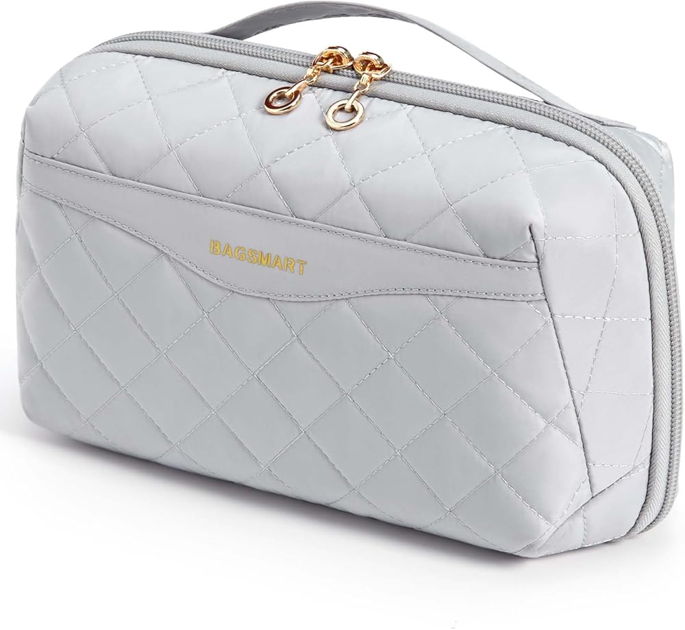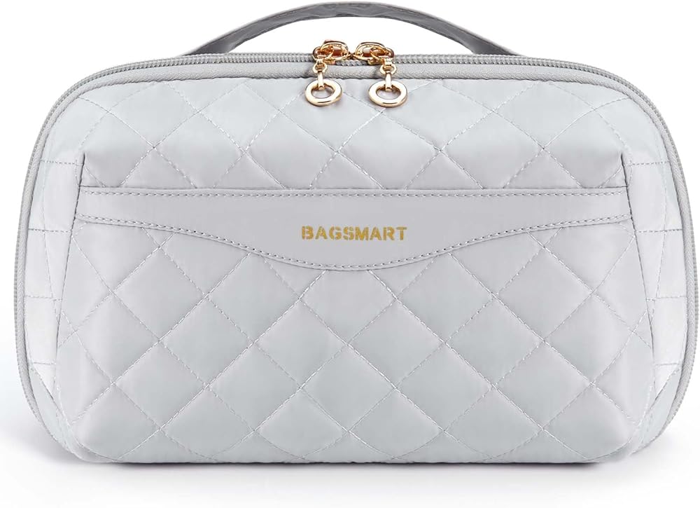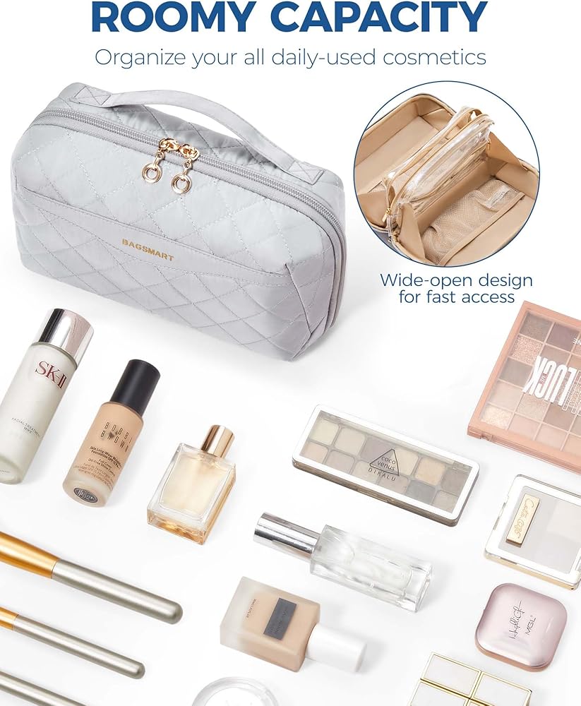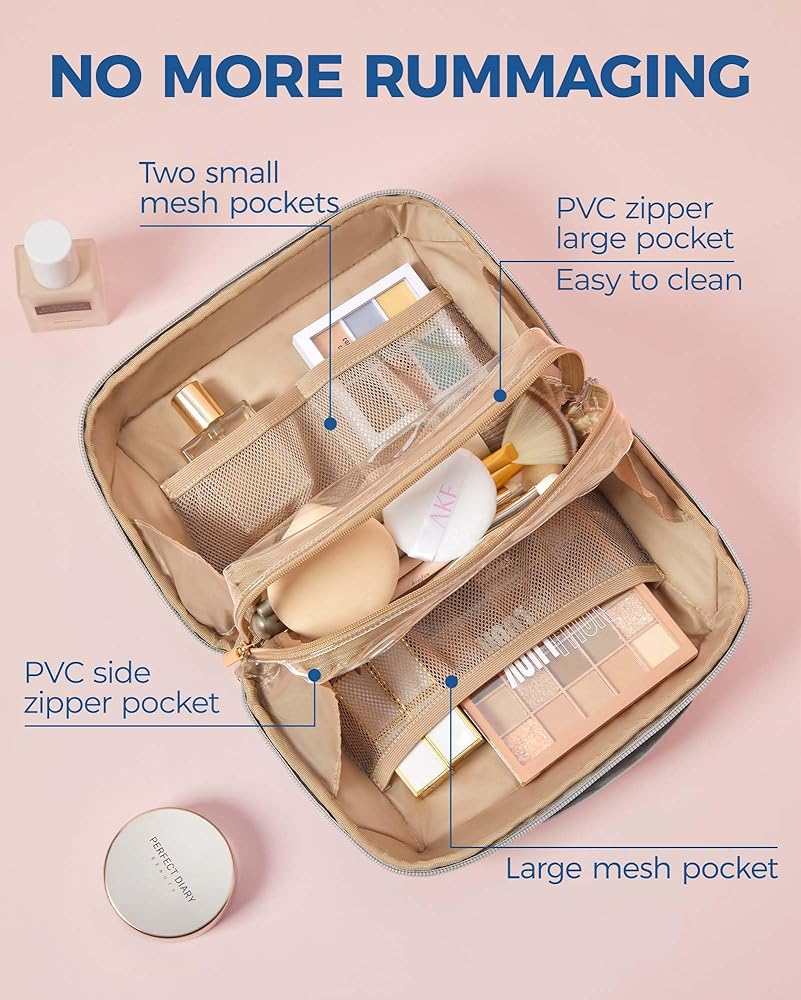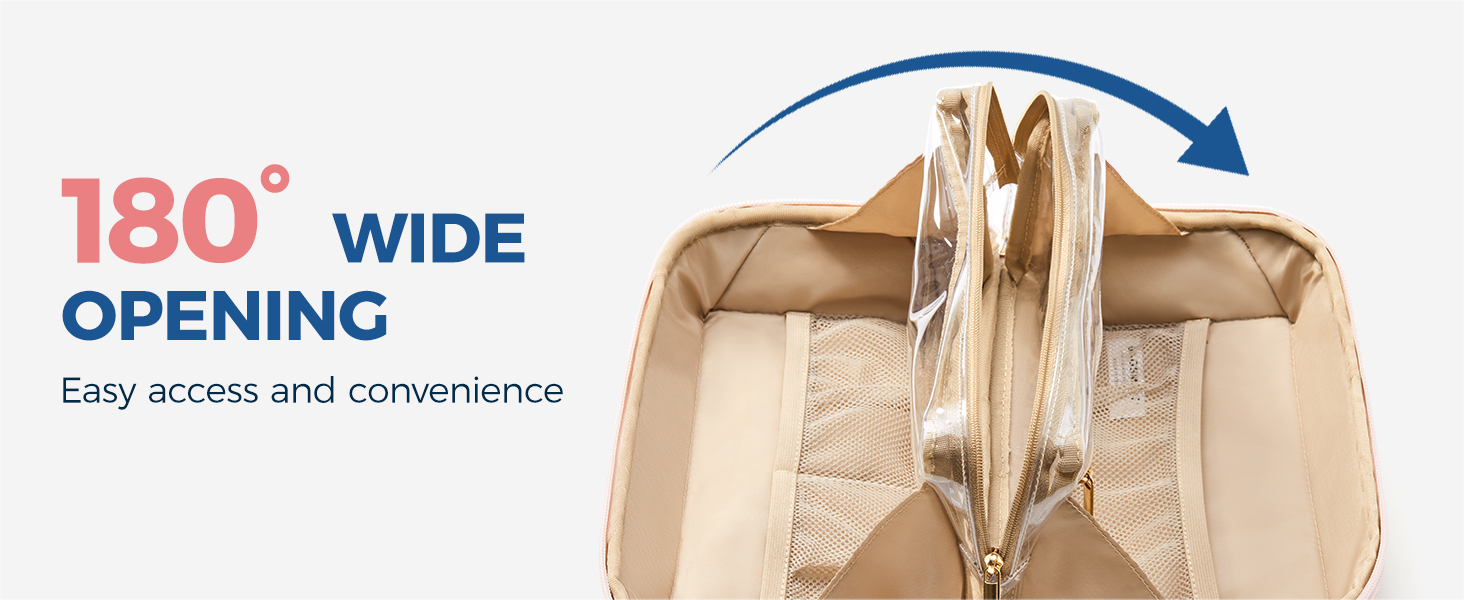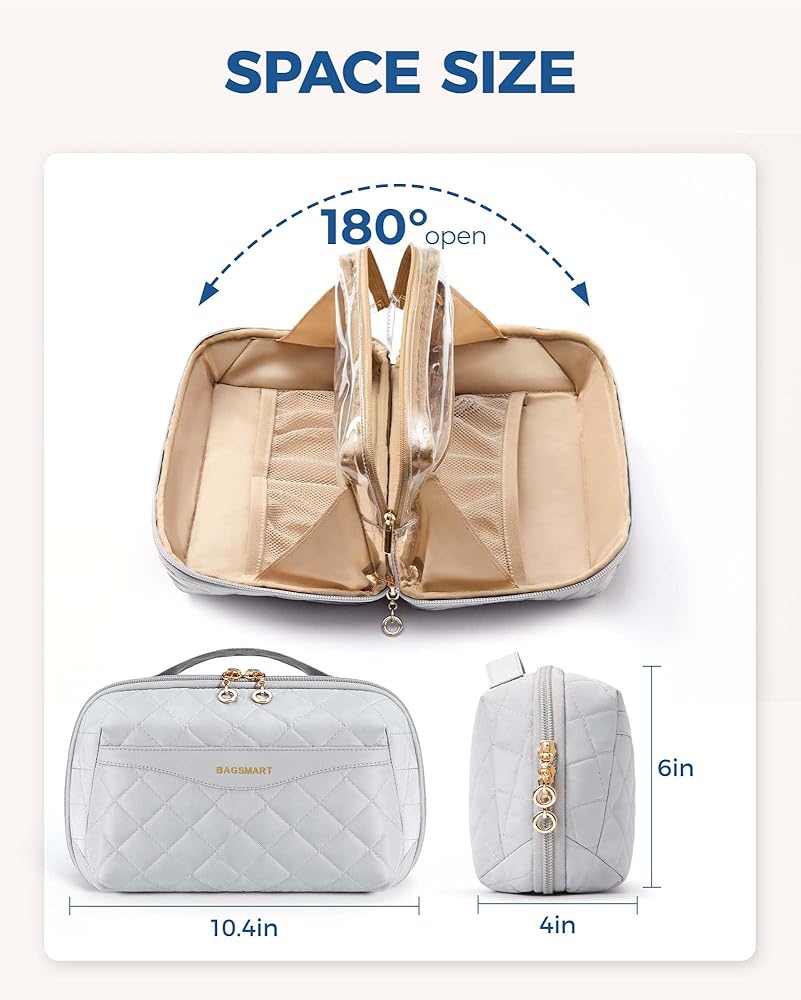 【وصول سريع إلى العناصر】: يمكن لحقيبة المكياج باجسمارت أن تفتح بالكامل 180 درجة من اليسار إلى اليمين، مما يوفر فتحة واسعة وواسعة، مما يسمح بسهولة الوصول إلى مستحضرات التجميل وأدوات النظافة وغيرها من مستلزمات السفر. بأبعاد 10.4 × 6.1 × 4 بوصات، فهي مثالية لتنظيم مستحضرات التجميل اليومية الخاصة بك لرحلة لمدة أسبوع أو للاستخدام اليومي.