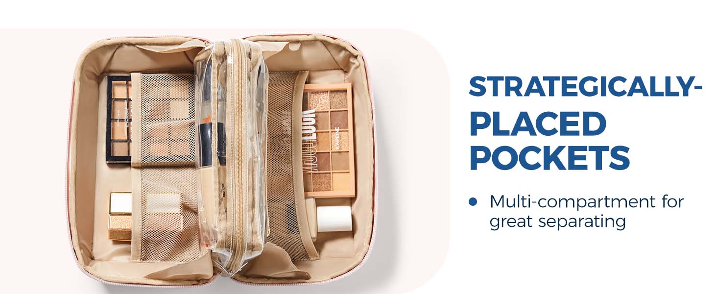 【تصميم جيب منظم جيدًا】: مساحات واسعة تتضمن جيبًا شبكيًا كبيرًا لكريم الأساس أو ظلال العيون، وجيبين شبكيين أصغر لأحمر الشفاه وأحمر الخدود والمزيد. يمكن للحقيبة البلاستيكية الشفافة الموجودة في المنتصف أن تحمل إسفنجات الفرشاة، في حين أن الجيب الجانبي المصنوع من مادة PVC مثالي لنفخ البودرة.