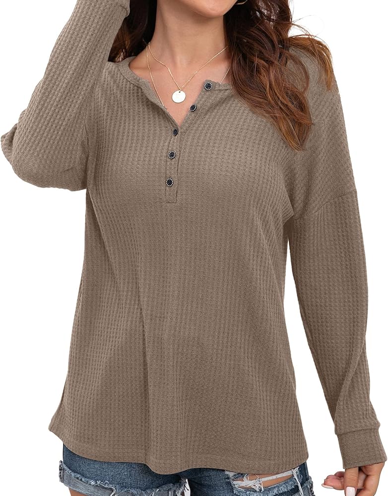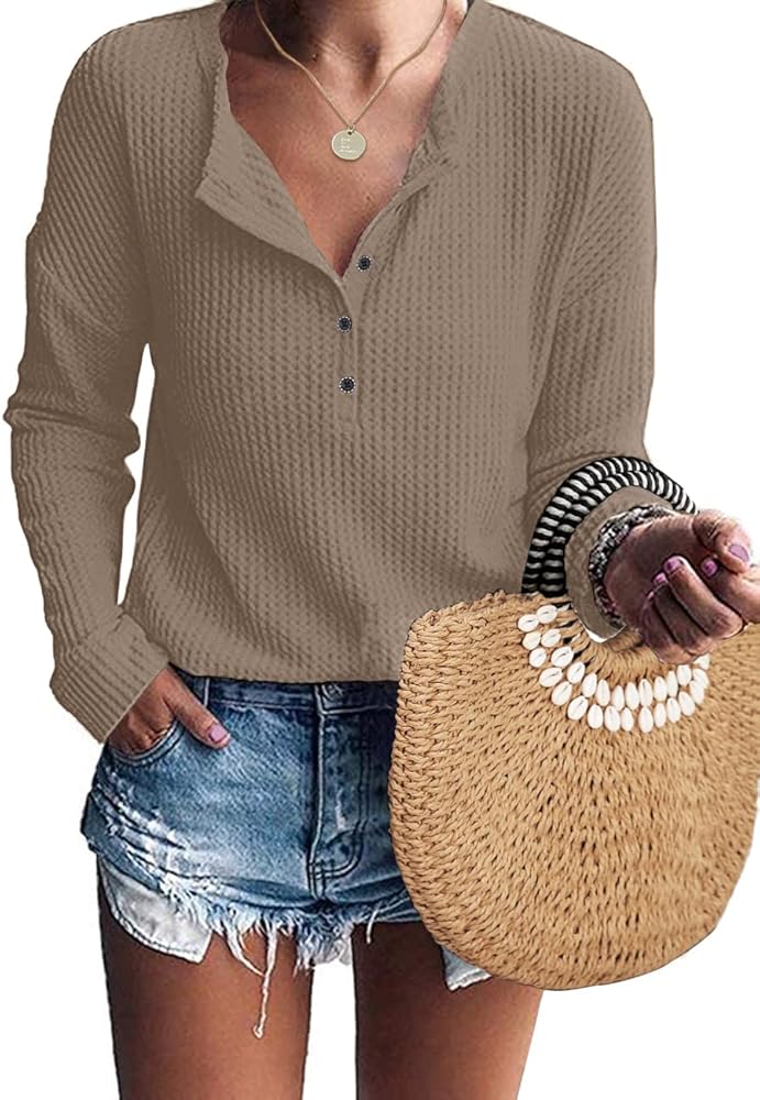 قميص نسائي من IWOLLENCE بأزرار للأسفل وأكمام طويلة، قميص هينلي، سترة منسوجة على شكل حرف V، ملابس فضفاضة