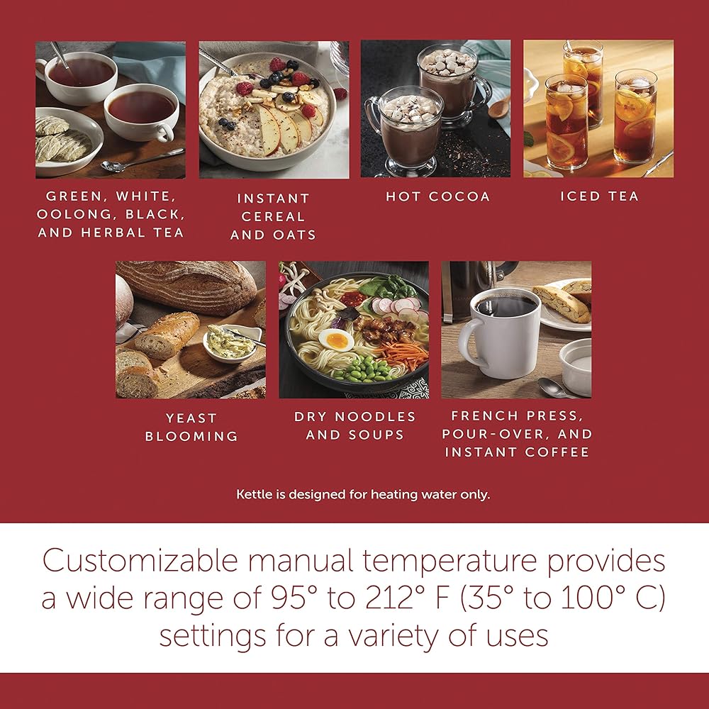 • إعداد درجة حرارة يدوي قابل للتخصيص. مع هذه الغلاية الكهربائية، يمكنك الاختيار من بين مجموعة واسعة من إعدادات 95 درجة إلى 212 درجة فهرنهايت (35 درجة إلى 100 درجة مئوية) لمجموعة متنوعة من الاستخدامات، مثل تسخين الماء والكاكاو الساخن وصب القهوة وتفتح الخميرة والحبوب الفورية.
