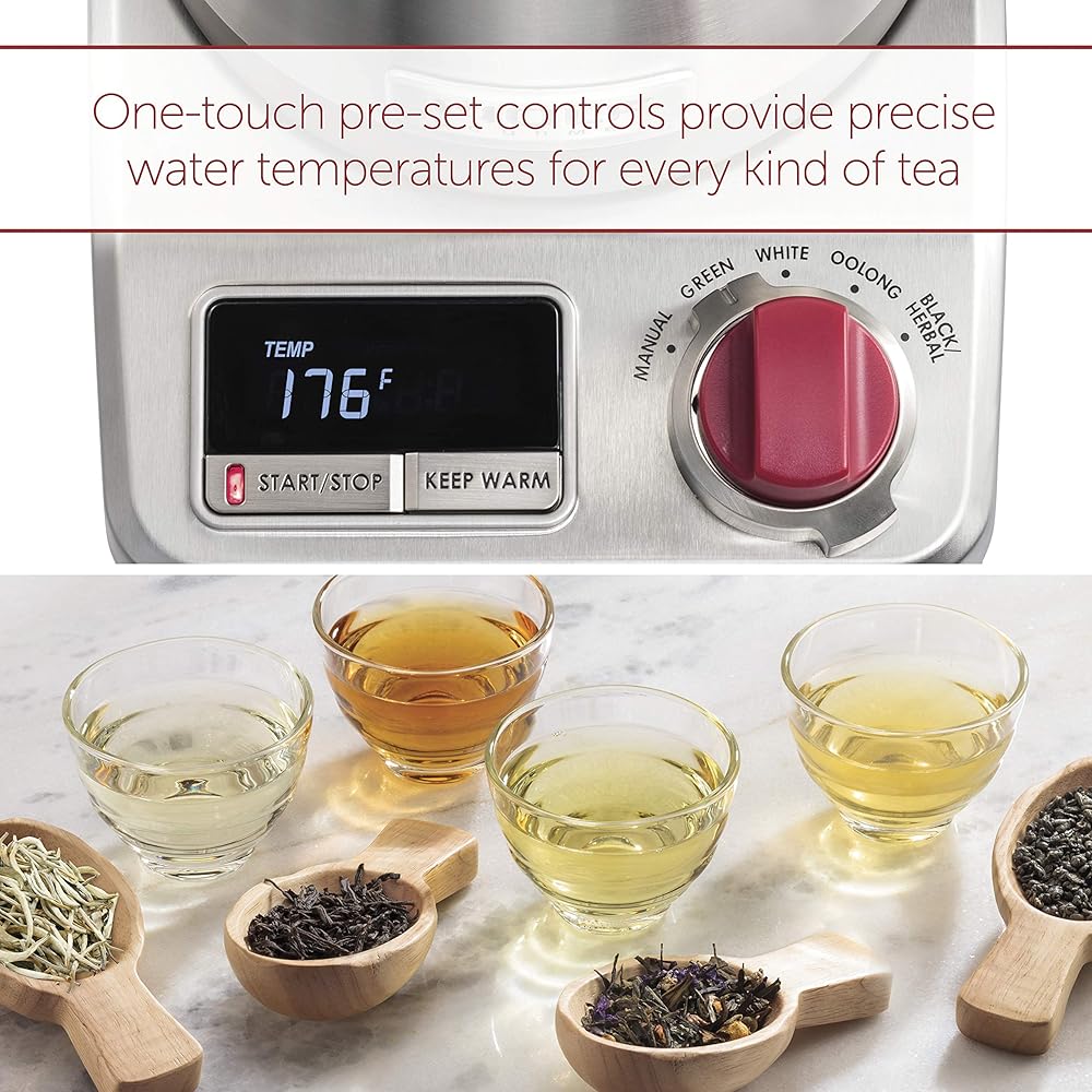 • تحكم مسبق الضبط بلمسة واحدة لدرجة حرارة المياه الدقيقة. تضمن اللمسة الواحدة وصول الماء إلى درجة الحرارة المثالية للشاي الأخضر والأبيض والاولونج والأسود/العشبي.