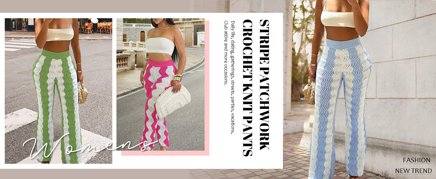بنطال CALEBGAR نسائي واسع الساق كاجوال مخطط ومرن من الكروشيه