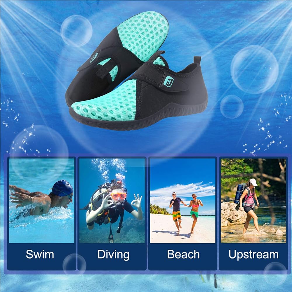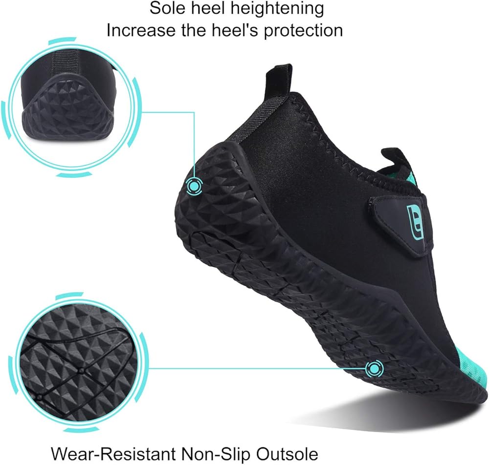 نعال سميكة وحماية جيدة: هذه الأحذية الرياضية المائية مصنوعة من نعال مطاطية سميكة، مضادة للانزلاق ومتينة، مما يحمي قدميك من التعرض للأذى بسبب الأشياء الحادة عندما تمشي أنت وعائلتك على البحر أو السباحة أو الغوص أو ركوب الأمواج.