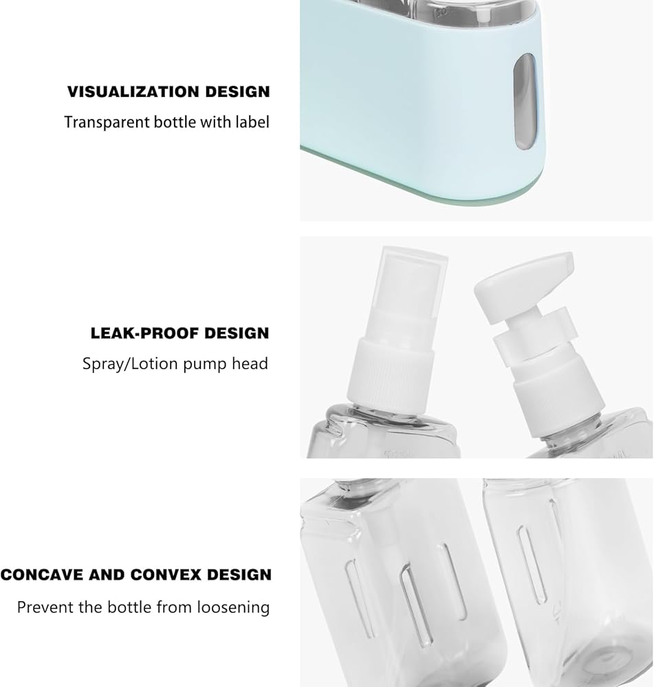 • تصميم خاص مانع للتسرب: تصميم زجاجات أدوات الزينة للسفر القابلة لإعادة الملء مع مشابك مانعة للتسرب أو غطاء مانع للتسرب في كل زجاجة وصندوق التغليف بغطاء بلاستيكي، كل هذه التصميمات يمكن أن تتجنب تسرب السائل أو انسكابه أثناء السفر. قم بحماية حقيبتك وملابسك من الاتساخ.