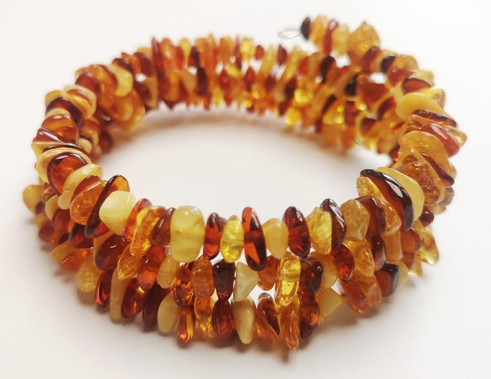 MULTI-LAYERED STYLISH AMBER STONE BRACELET. This natural gemstone bracelet has clear and matte stones of 0.2 - 0.4” diameter. The flat amber pebbles are held on a shape-maintaining wire that is easy to wear. The genuine baltic amber stones are hand-picked. It is natural perfection.