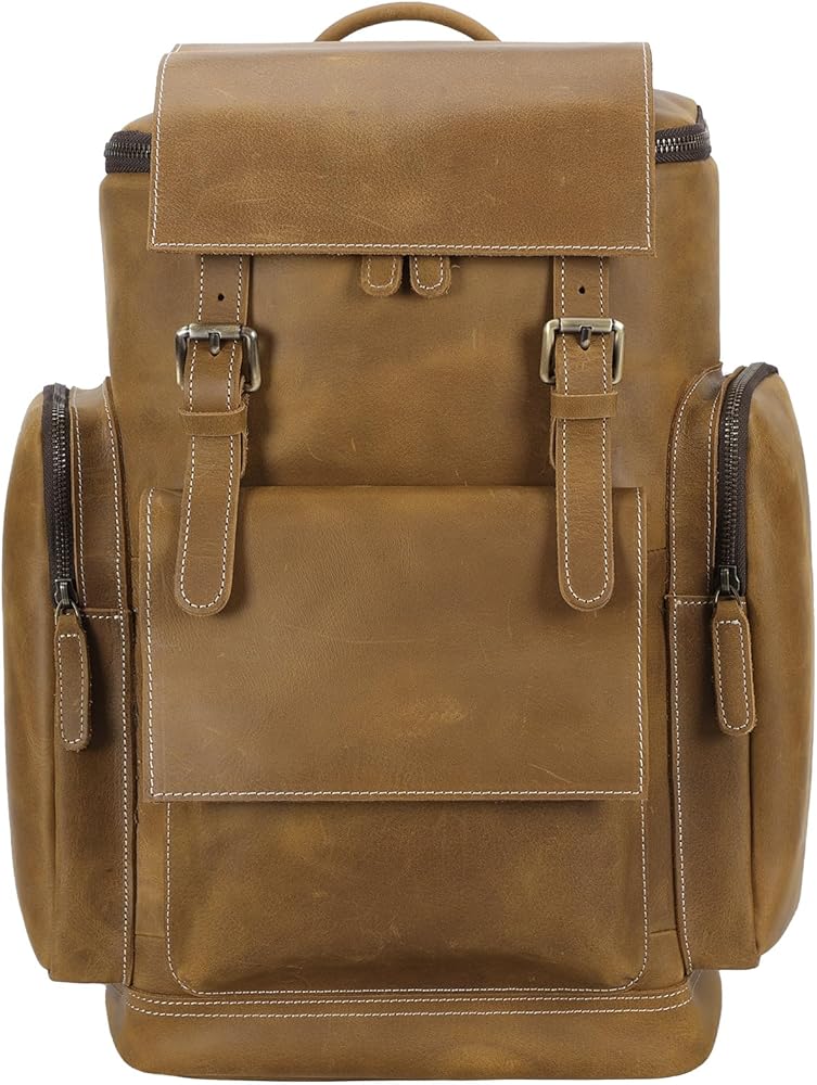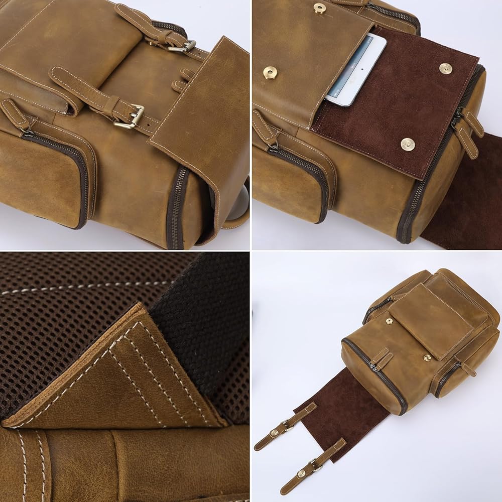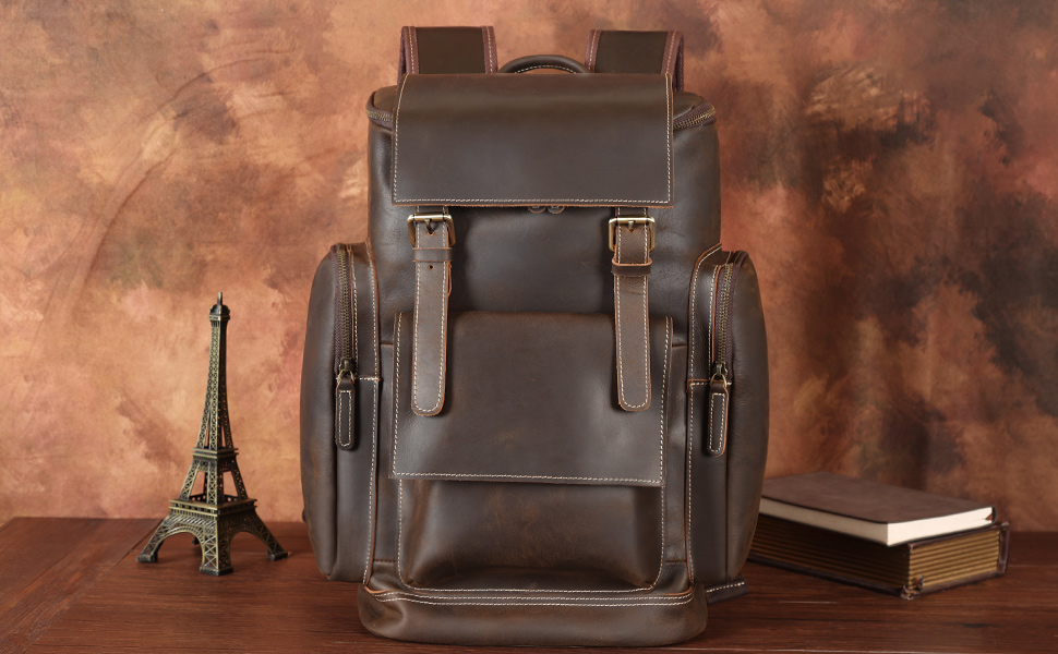 • 【Well Organized】1*front flap zipper pocket, 2* side zipper pockets,1 *back zipper pocket,1 * main compartment with removable 15.6" laptop sleeve,1* inner zipper pocket, 2* inner pouches, 1 card holder and 2 glasses slots on shoulder straps, can keep a lot of sutffs well organized. This Leather rucksack backpck is suitable for hiking, camping, travel, business work.