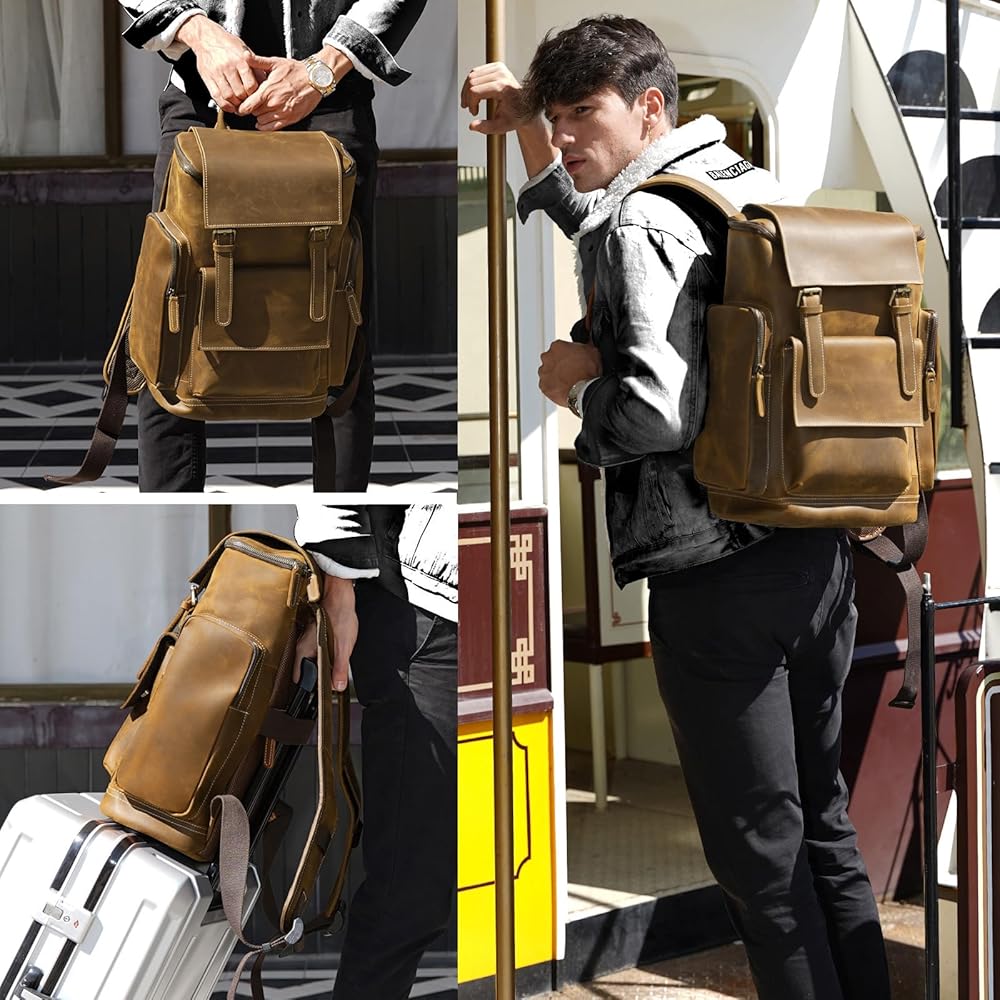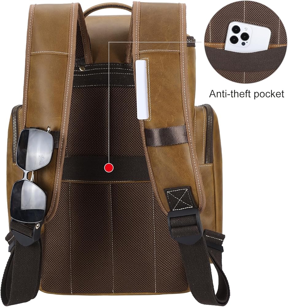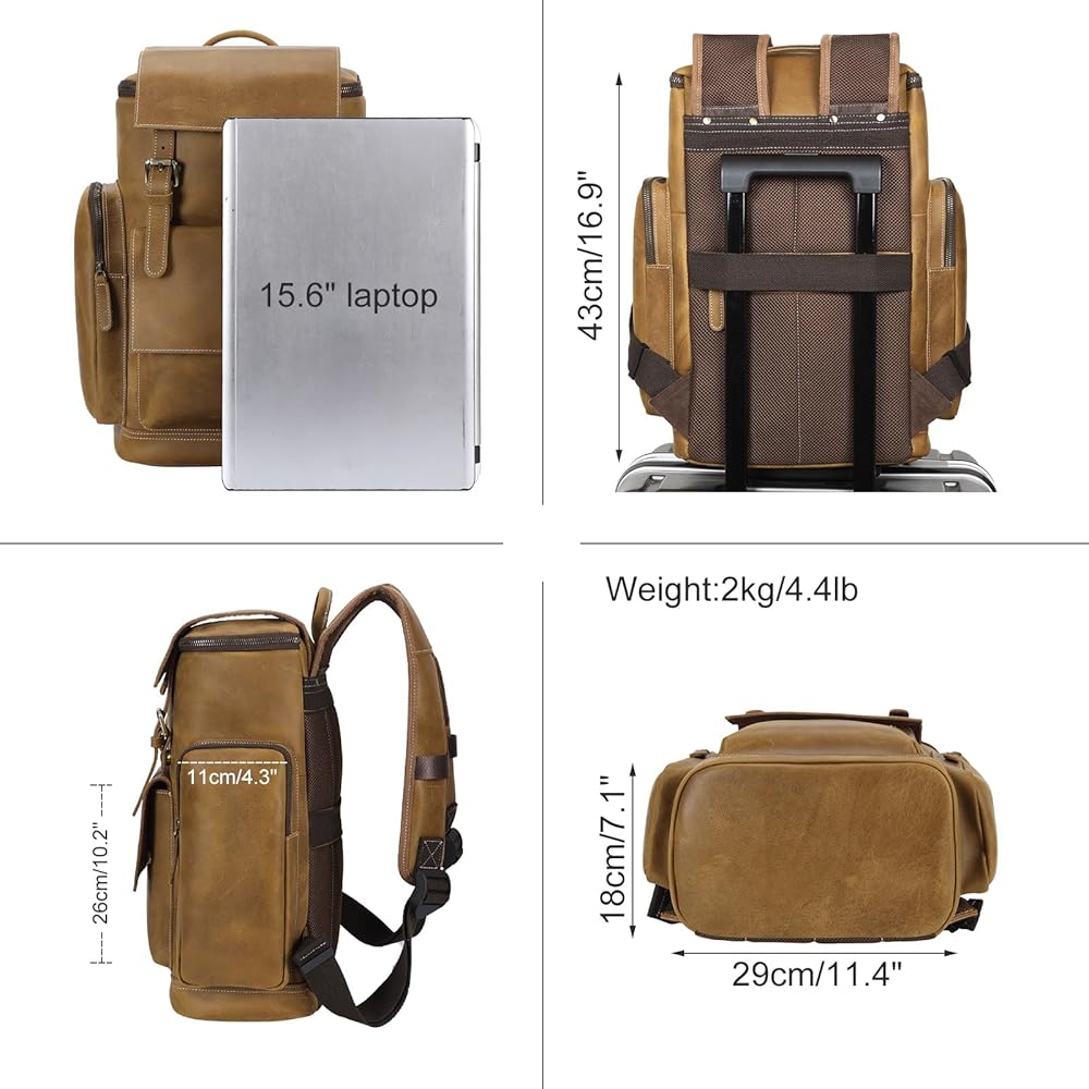 • 【Large Capacity】The large leather backpack for men in size about 11.4"(L)*7.1"(W) *16.9"(H), Weight:1.85kg/4lb. Spacious enough to fit your everyday essentials such as laptop(15.6"), files, umbrella, water bottles,and garments. Wide-open top zipper of vintage backpack for men allows you to take items out easily, you also don't need to worry about item safety because there is flapped area for safekeeping . A perfect leather laptop or computer backpack .