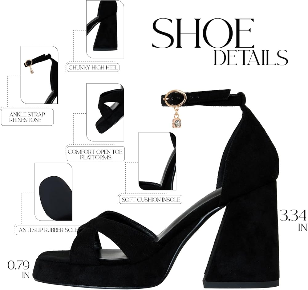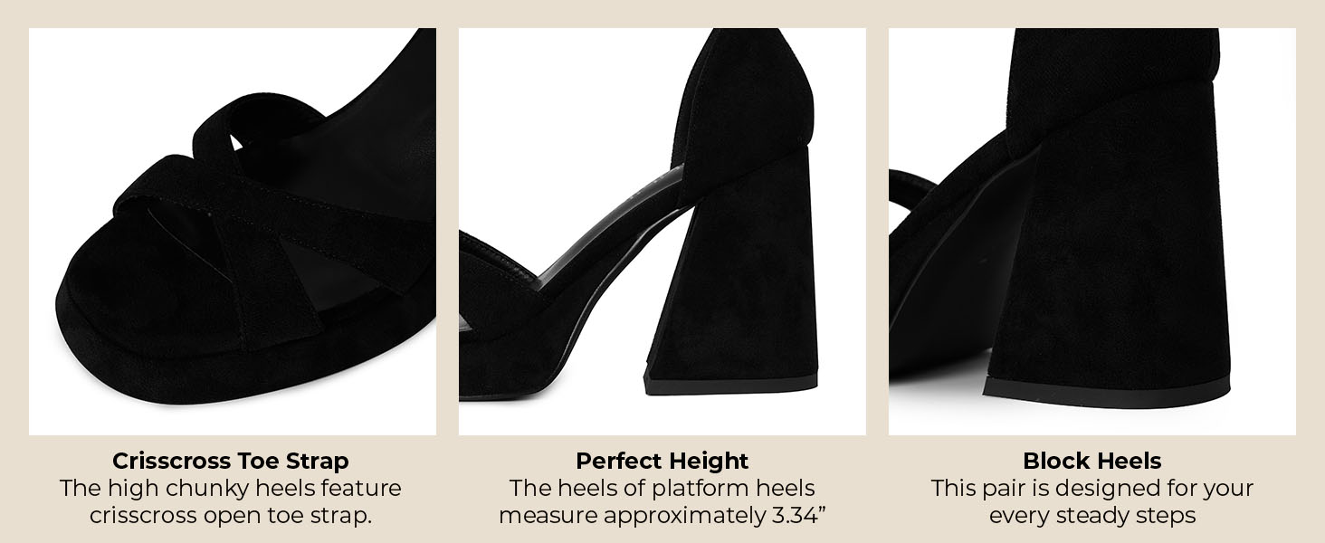 ارتفاع مثالي: يبلغ مقاس الكعب ذو الكعب العالي 3.35 انش تقريبًا، ويبلغ مقاس منصات الصنادل ذات الكعب العالي حوالي 0.8 انش وهو الزوج المثالي لإضافة بضع بوصات إلى إطارك.