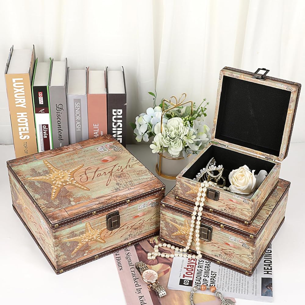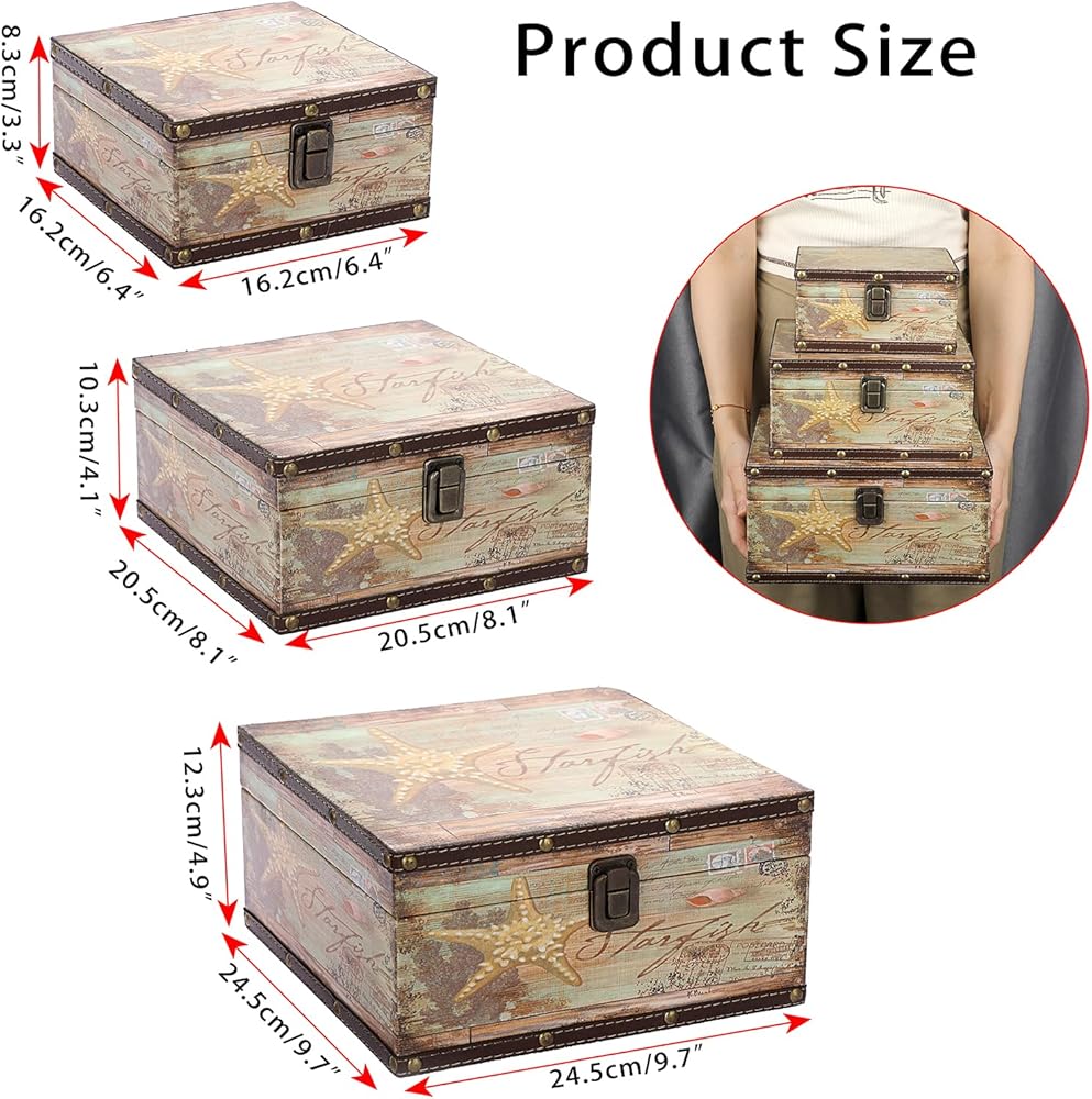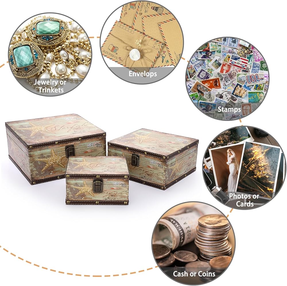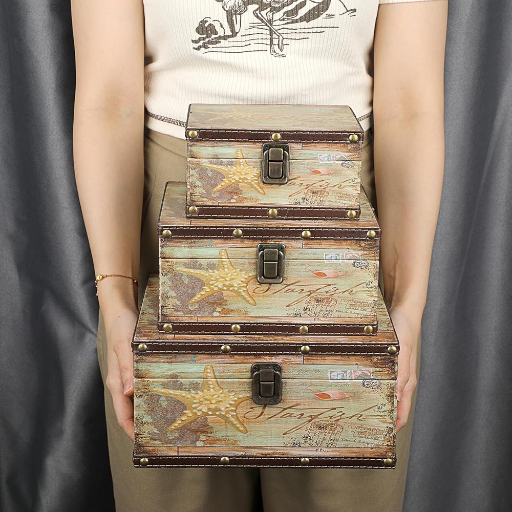 إلدو مجموعة من 3 صناديق كنز عتيقة، صندوق تذكارات القراصنة لهدايا الاطفال، صندوق تخزين كنز خشبي للبنات والنساء، صندوق مزخرف للمجوهرات وحلي اللؤلؤ