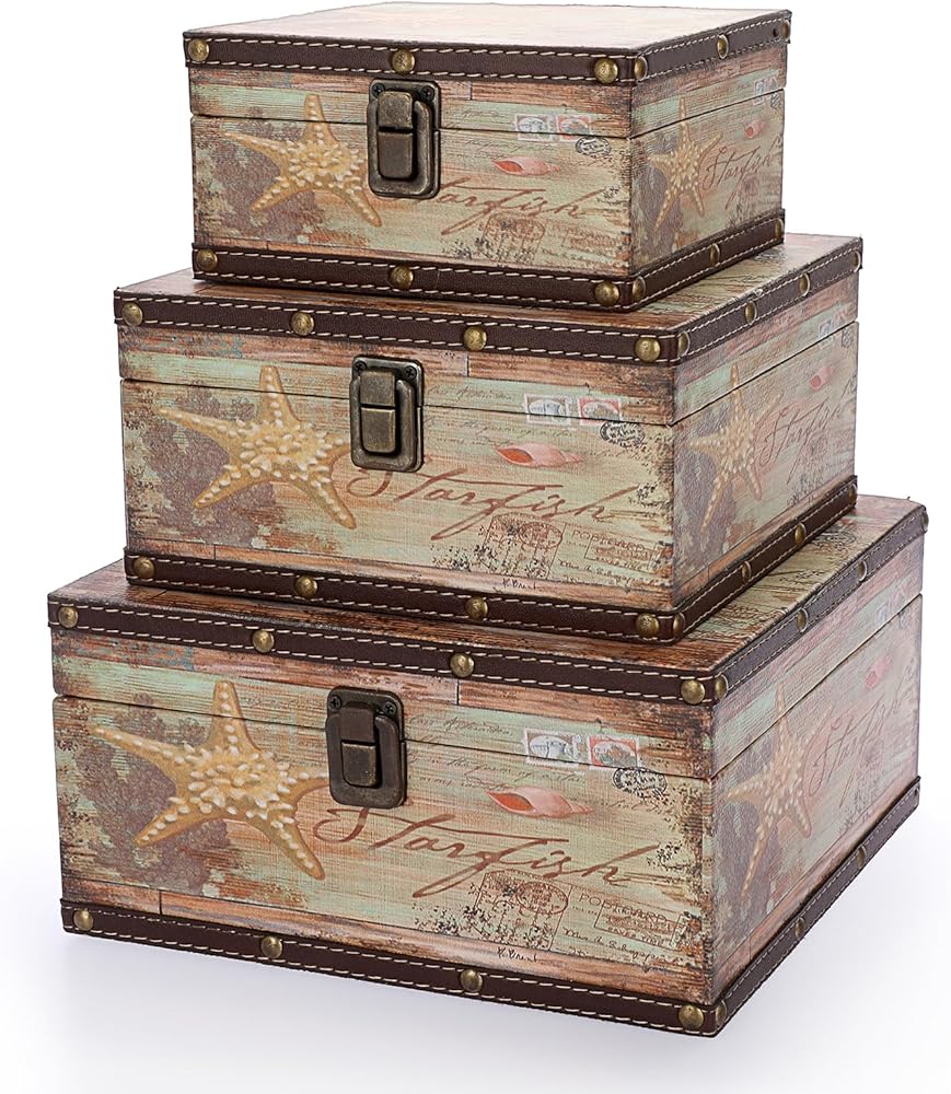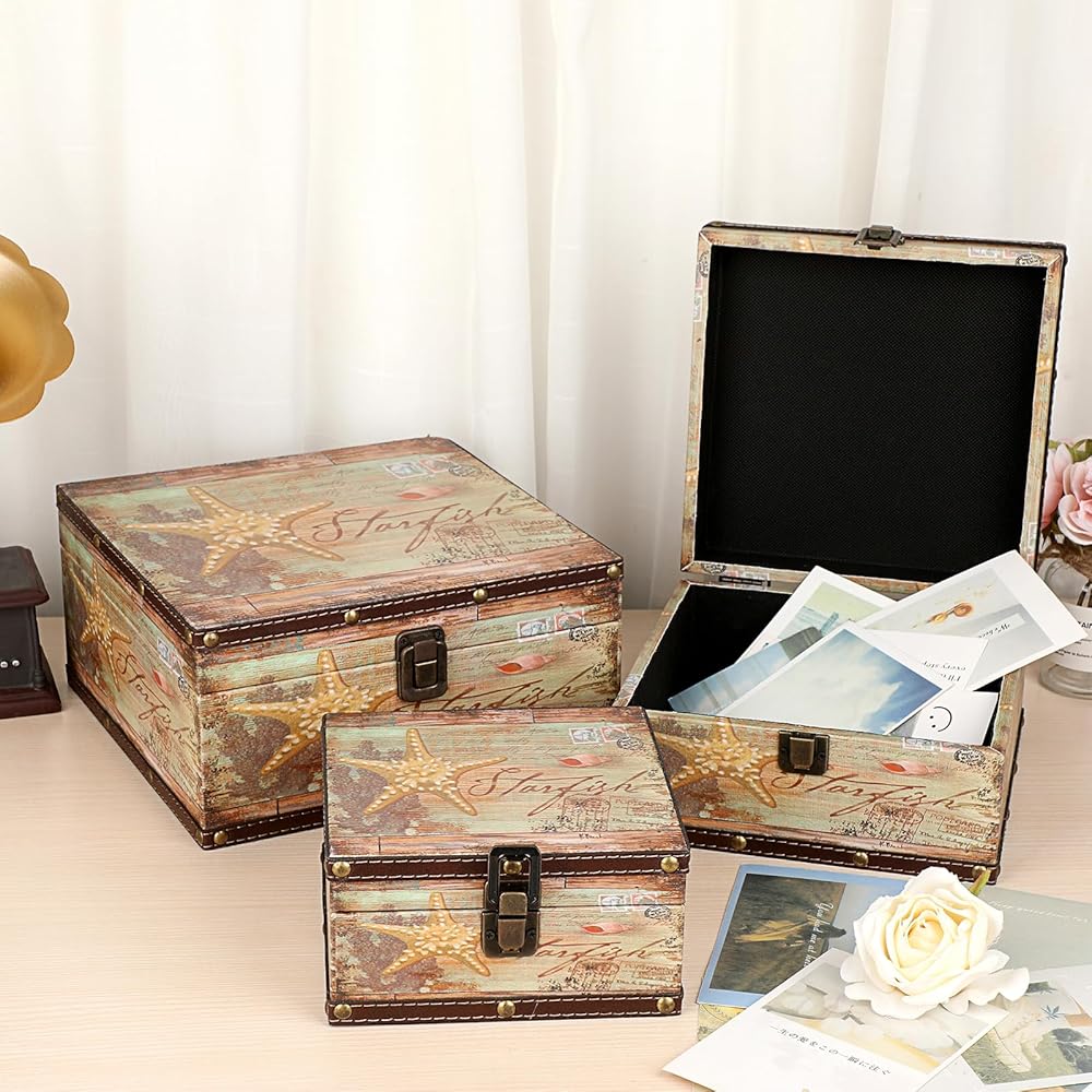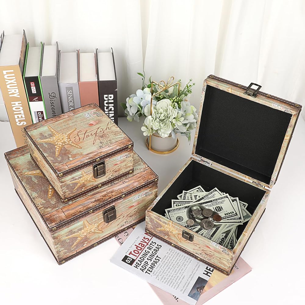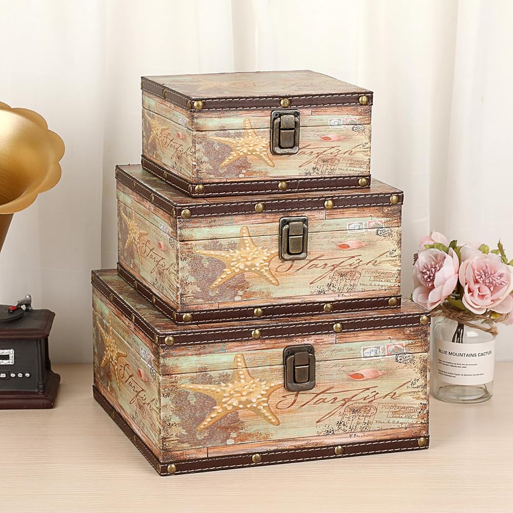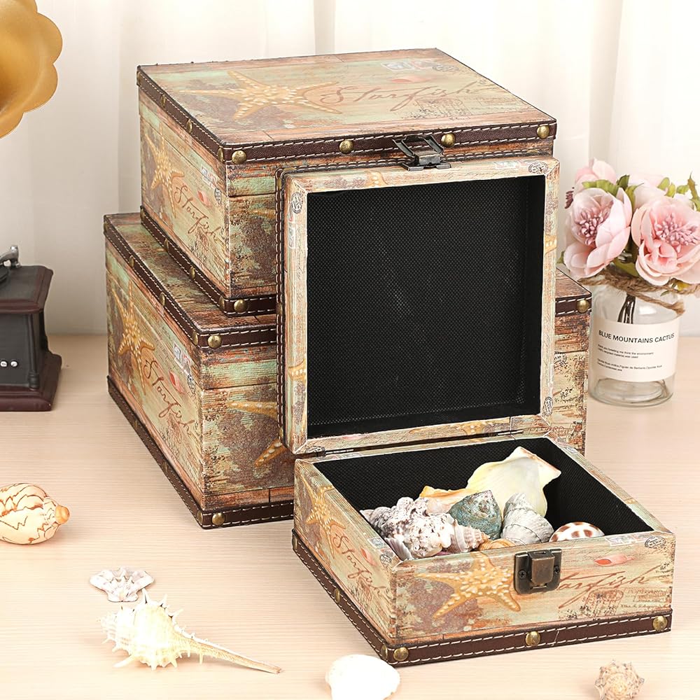 إلدو مجموعة من 3 صناديق كنز عتيقة، صندوق تذكارات القراصنة لهدايا الاطفال، صندوق تخزين كنز خشبي للبنات والنساء، صندوق مزخرف للمجوهرات وحلي اللؤلؤ