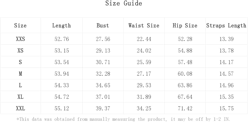 XS:Bust:29.1IN,Hip Size:54.9IN,Length:53.1IN,Straps Length:13.8IN,Waist Size:24.0IN