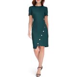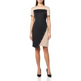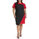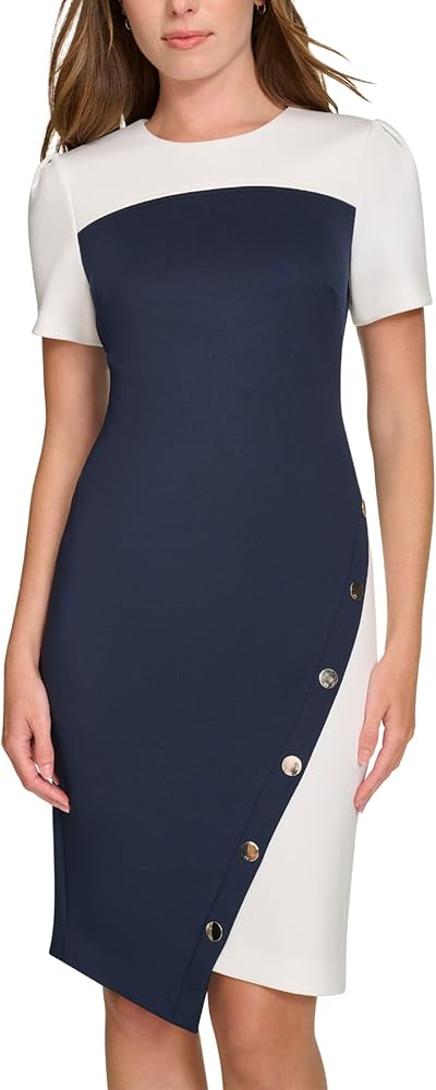 Features: Scuba crepe, structured, colorblock, short sleeve, asymmentrical, sheath