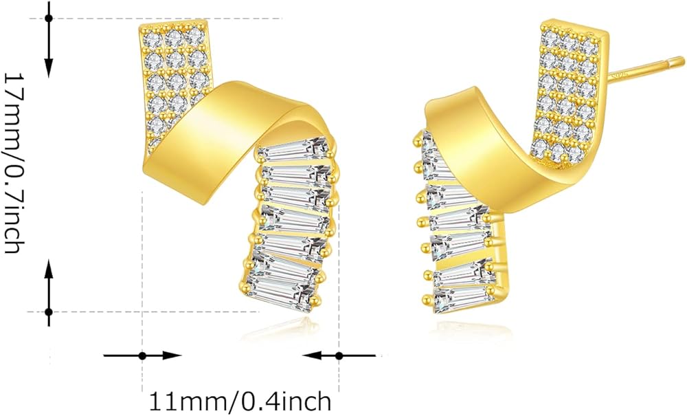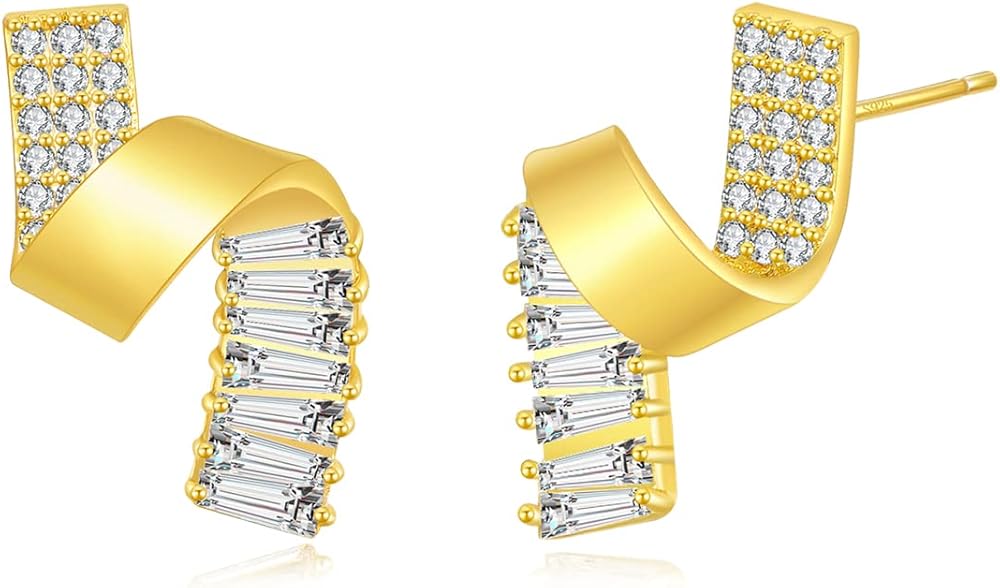PHNIBIRD Gold Stud Earrings Twirl Shape Ribbon Square Cubic Zirconia Earrings Studs Hypoallergenic Unique Cute Lady Girl Gifts, 0.4"*0.7", Brass Sterling Silver, Cubic Zirconia