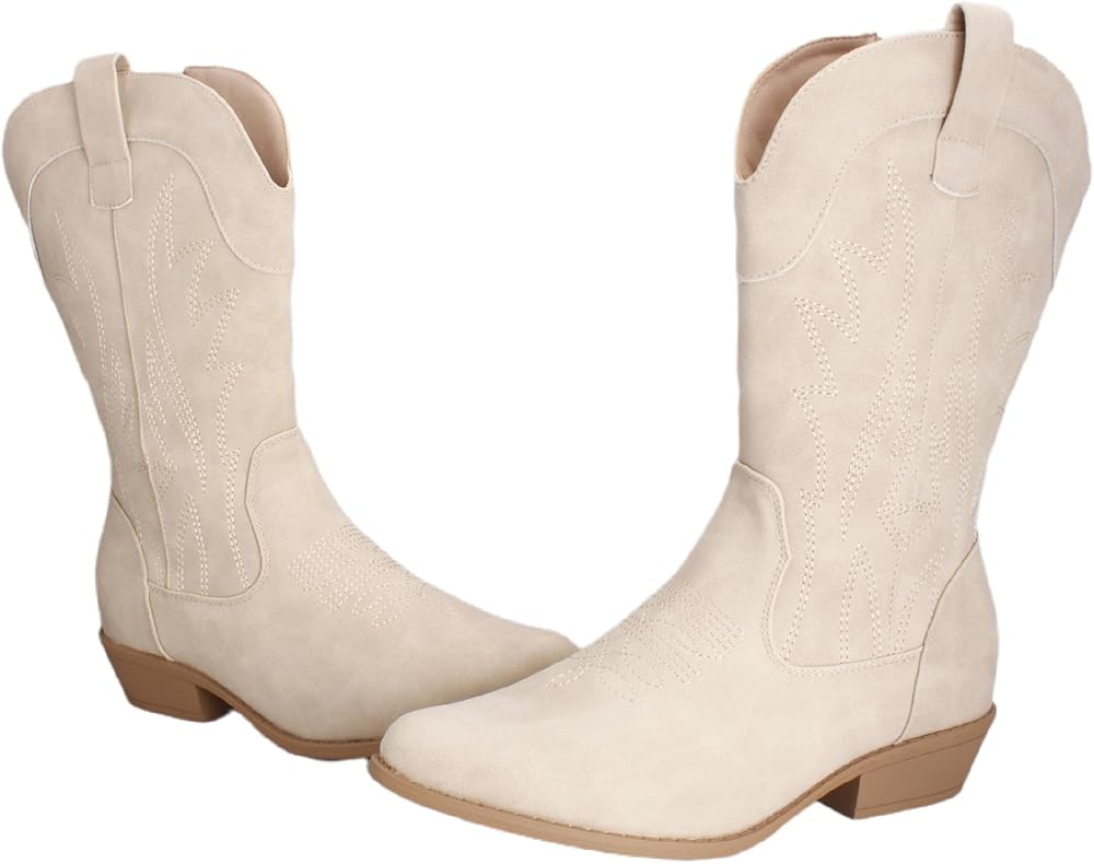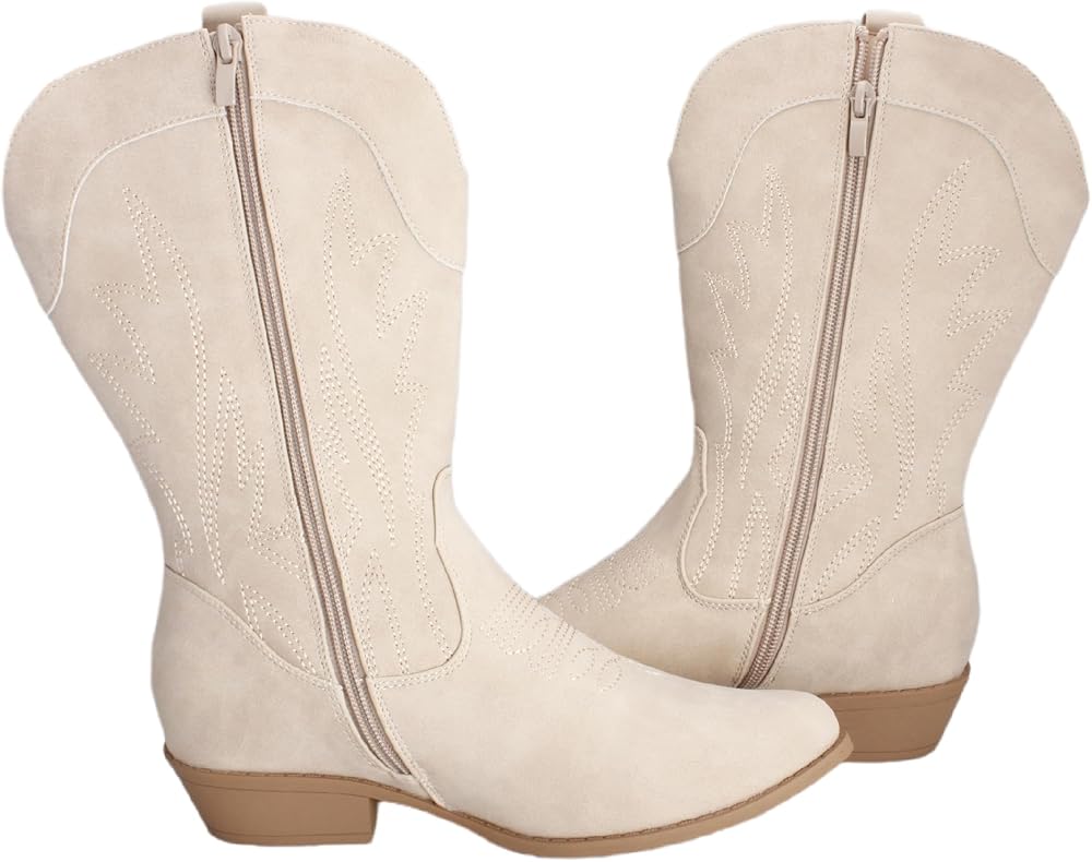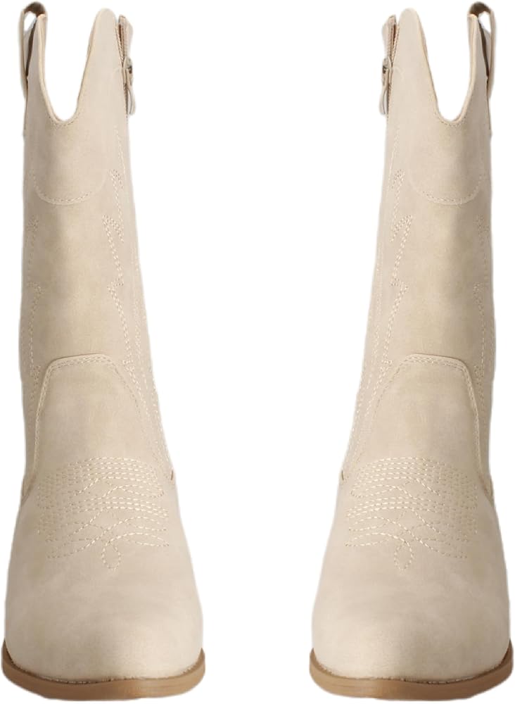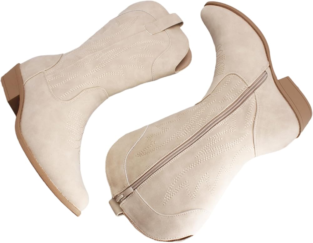 عمود حذاء واسع ليناسب معظم محيط ساق السيدات، أحذية راعية البقر متوسطة الساق هي طراز غربي كلاسيكي تقليدي مع سحاب طويل من الداخل لسهولة الارتداء والخلع، وتطريز كلاسيكي على الجزء العلوي، وكعب 1.4 بوصة للارتداء لفترة طويلة دون تعب قدميك، مثالي للارتداء اليومي