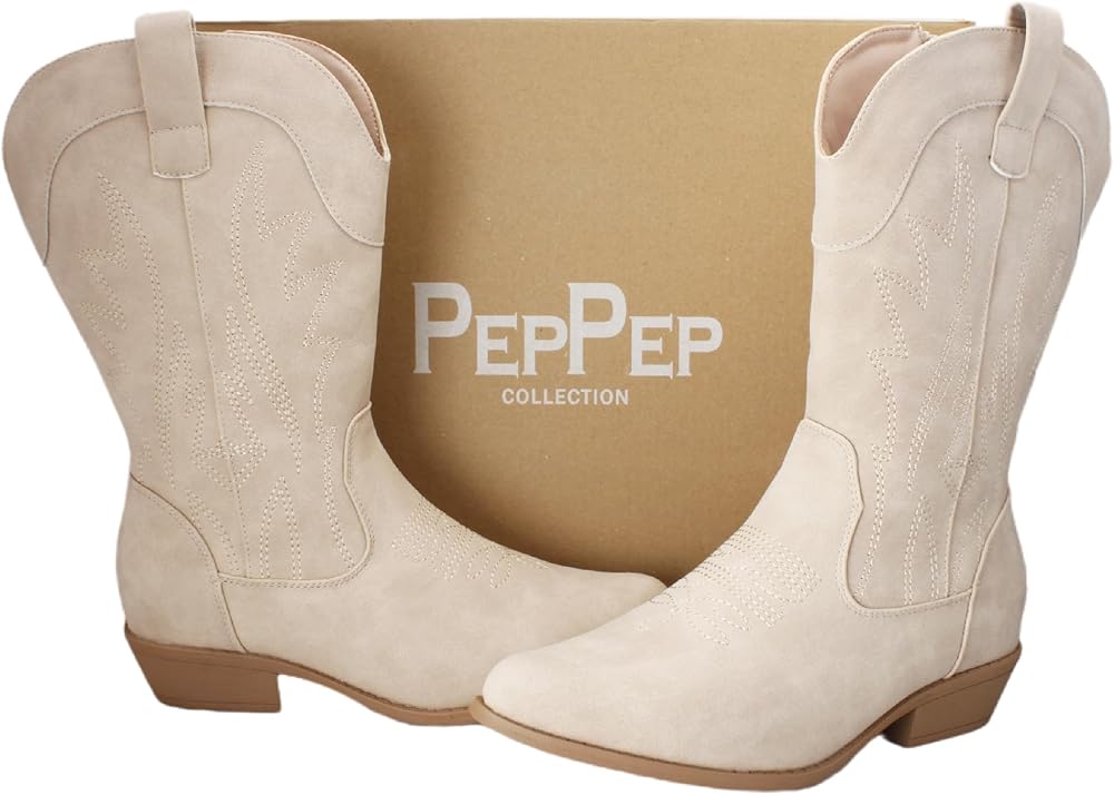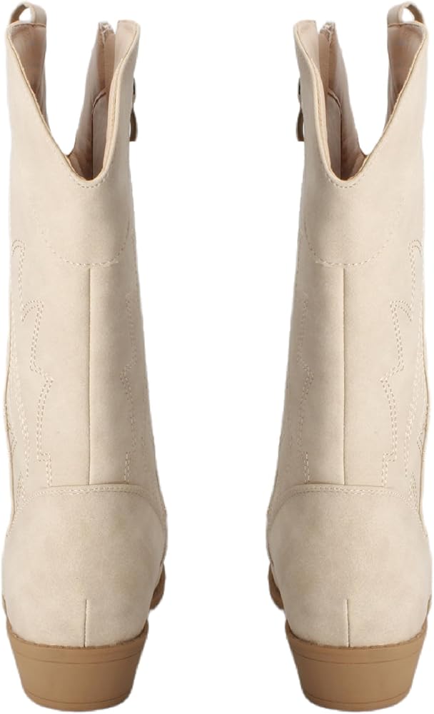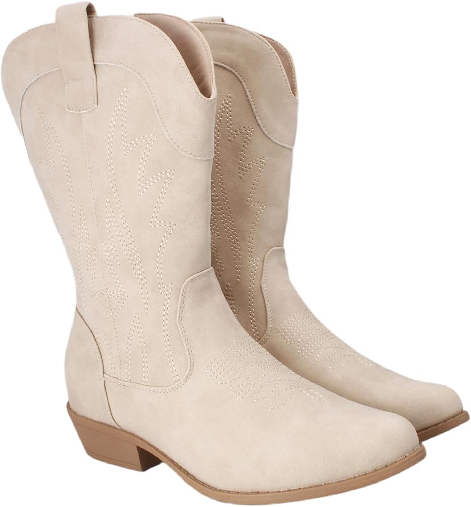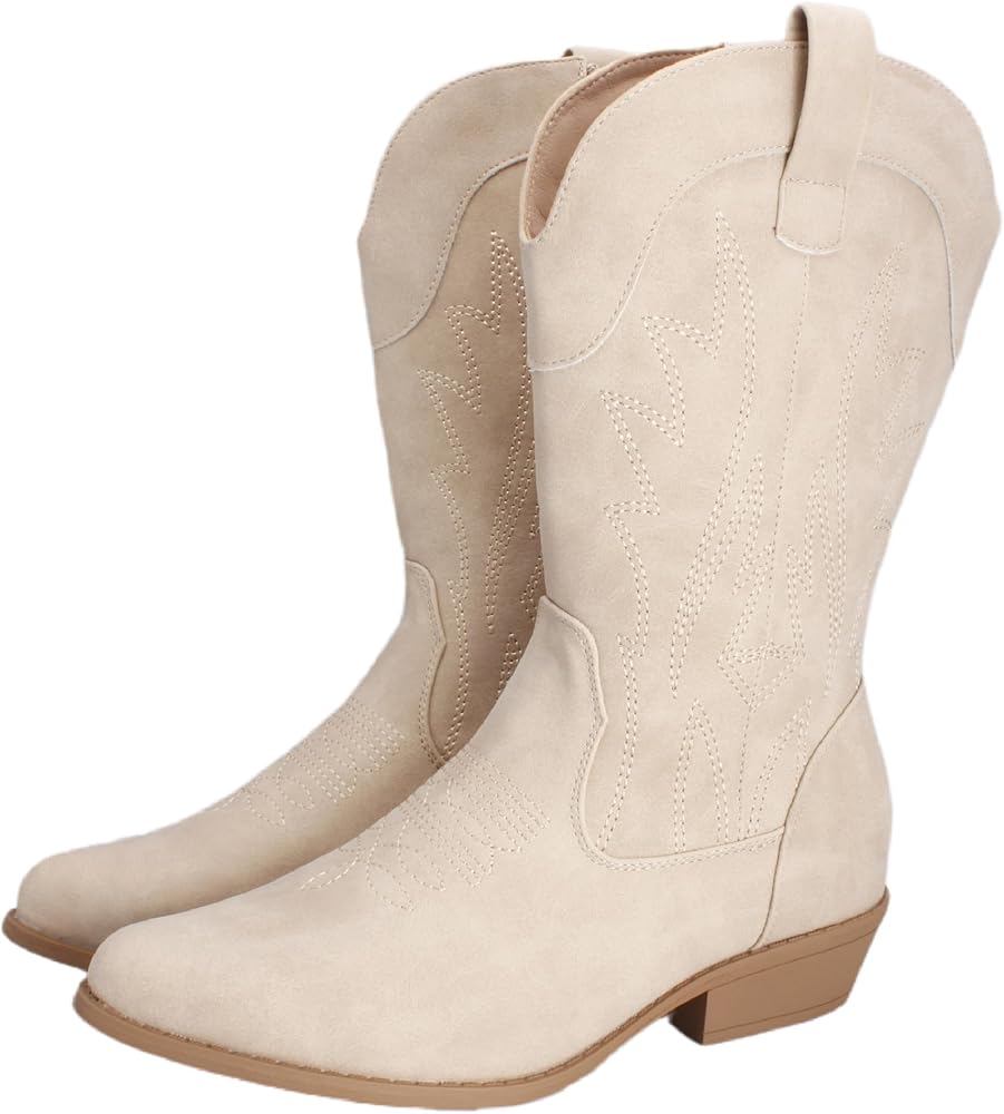 عمود حذاء واسع ليناسب معظم محيط ساق السيدات، أحذية راعية البقر متوسطة الساق هي طراز غربي كلاسيكي تقليدي مع سحاب طويل من الداخل لسهولة الارتداء والخلع، وتطريز كلاسيكي على الجزء العلوي، وكعب 1.4 بوصة للارتداء لفترة طويلة دون تعب قدميك، مثالي للارتداء اليومي