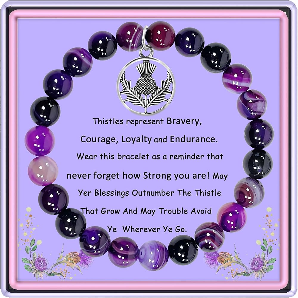 ❥خامة عالية الجودة: سوار الشوك الاسكتلندي مصنوع من خرز حجر الجمشت مقاس 8 مم. ارتدي سوار الشوك هذا كتذكير بأنك لن تنسى أبدًا مدى قوتك/شجاعتك!