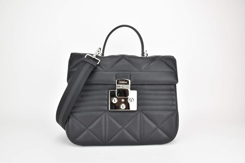 Furla Fortuna Ladies Medium Black Quilted Leather Cross body 988334. Product Dimensions: 9in (H) x 12in (L) x 5in (W). Features a flap with a push lock closure, an interior zip pocket, an interior slip pocket for mobile phone, a top handle and an adjustable & removable strap. Silver tone hardware. Medium sized black quilted leather cross body bag. Fortuna series.