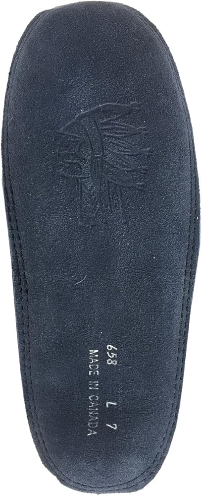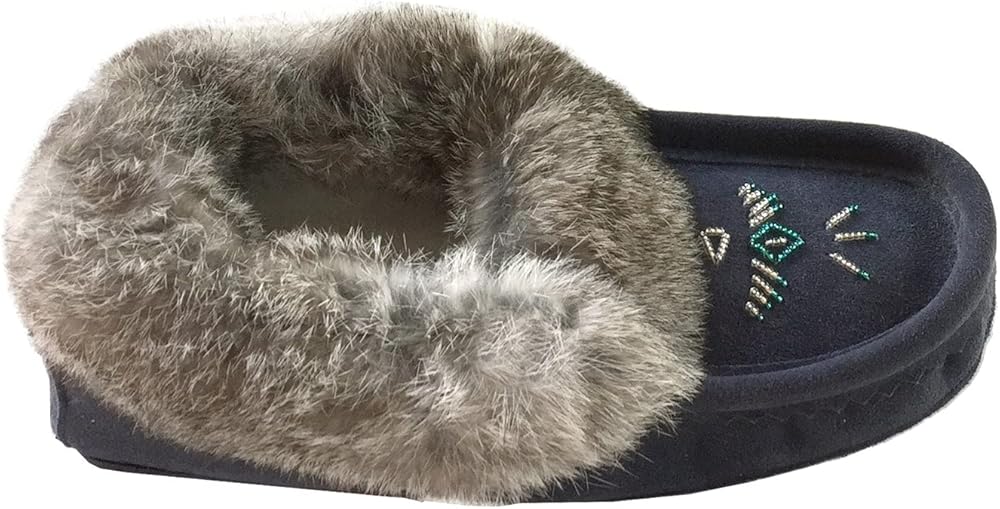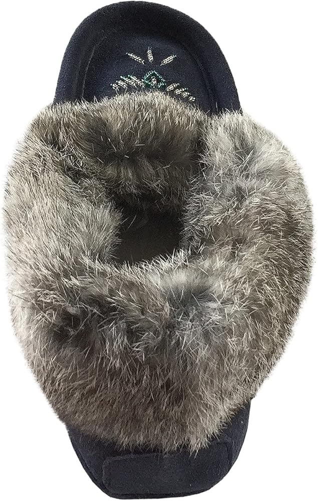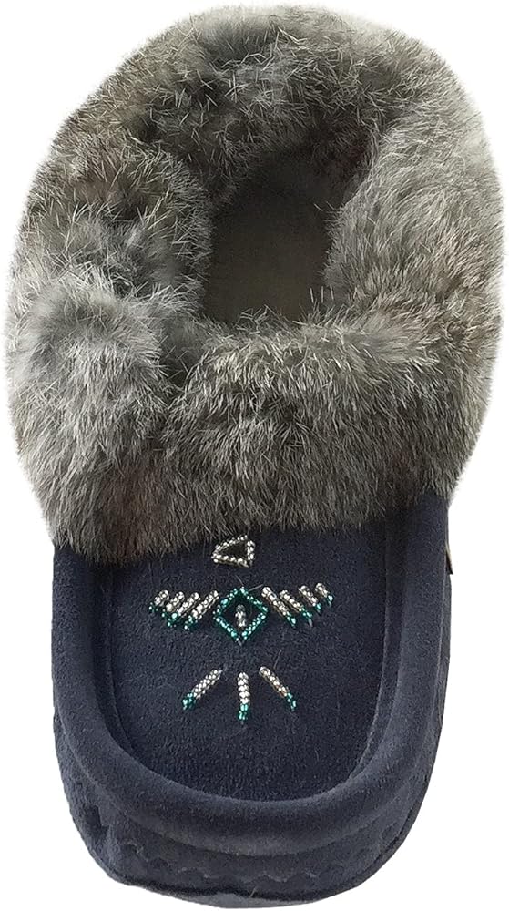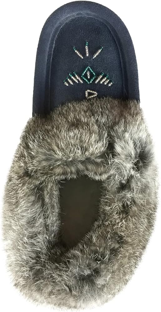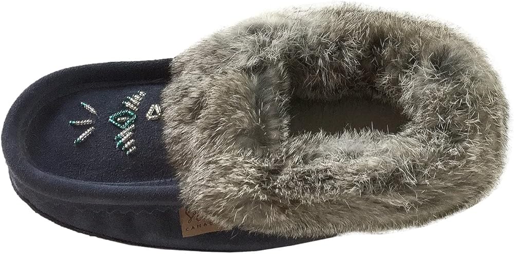 This fleece lined women's navy moccasin is made from genuine cow suede thus adding to the durability of this slipper. It is collared with genuine rabbit fur for added comfort and warmth.