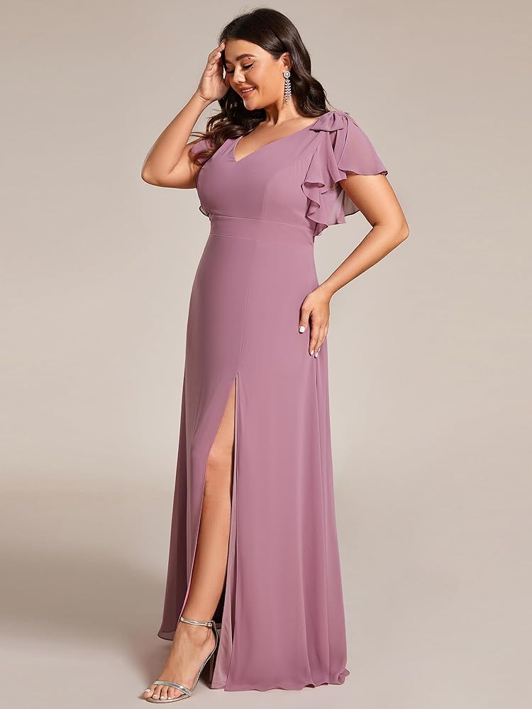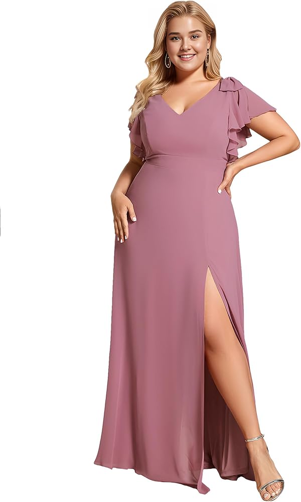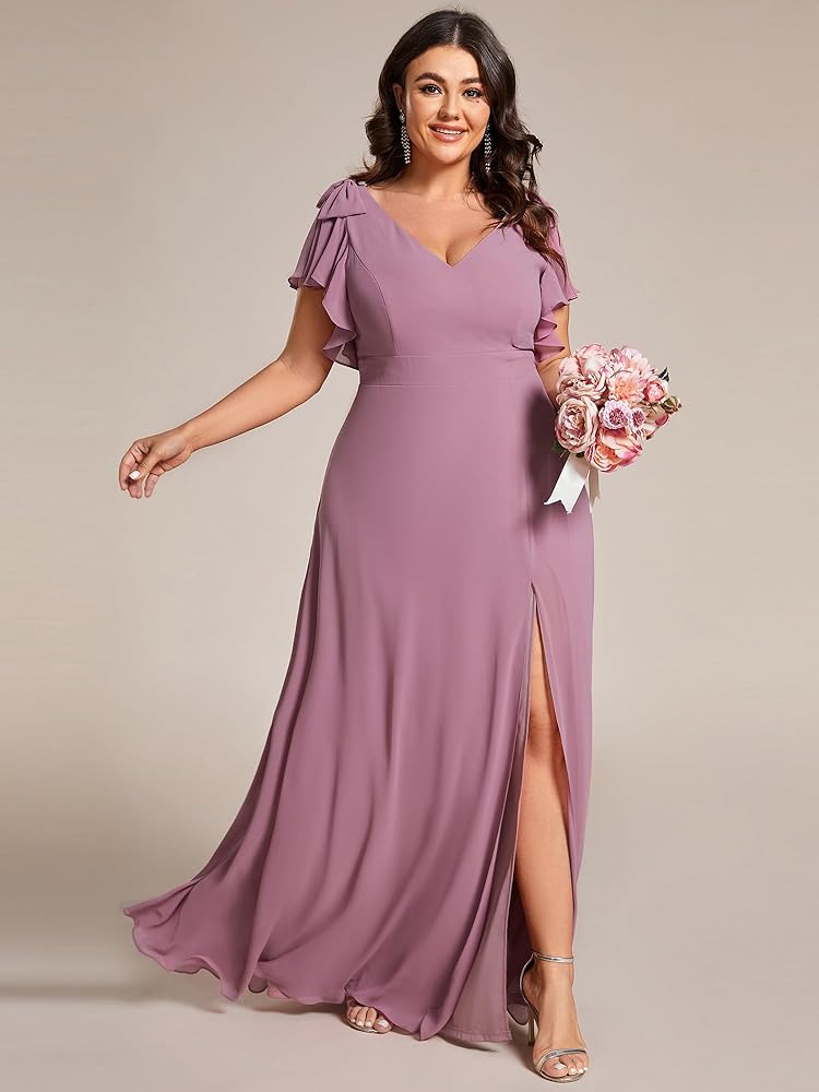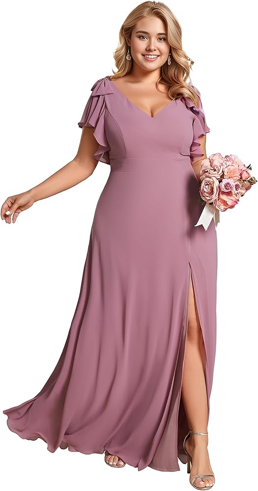 احتضن منحنياتك وأظهر أناقتك مع فستان وصيفة العروس من الشيفون ذو الأكمام الطويلة والمقاس الكبير مع عقدة على شكل حرف V ورقبة مزدوجة.