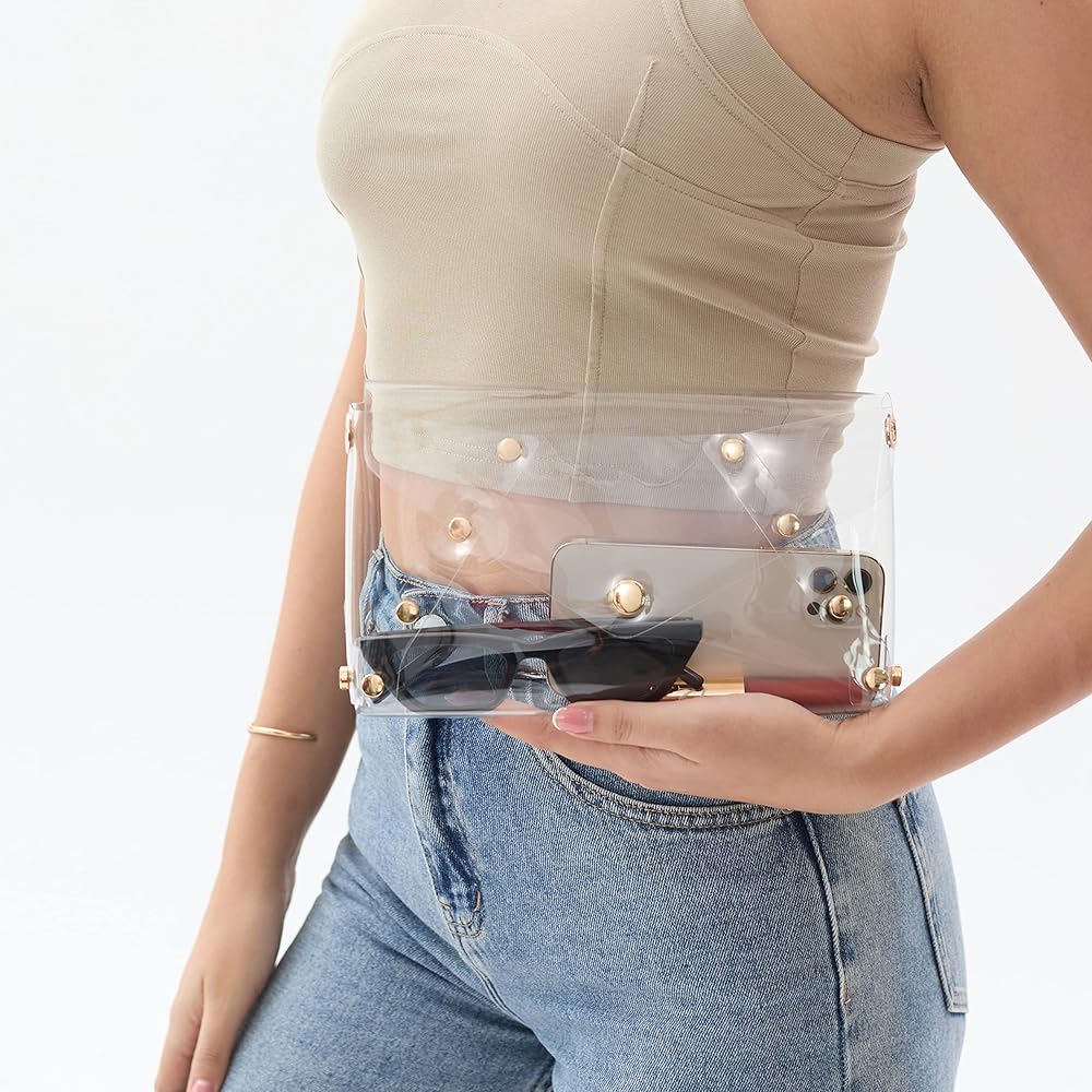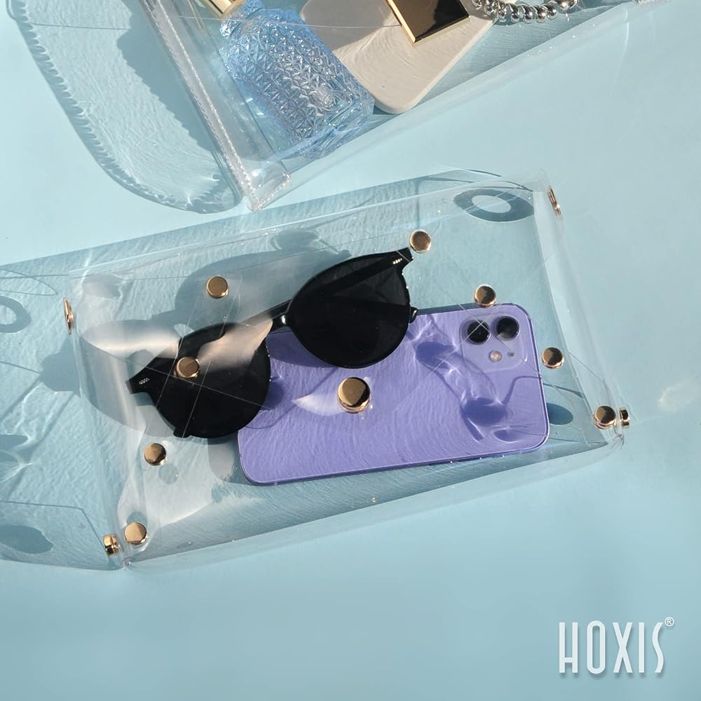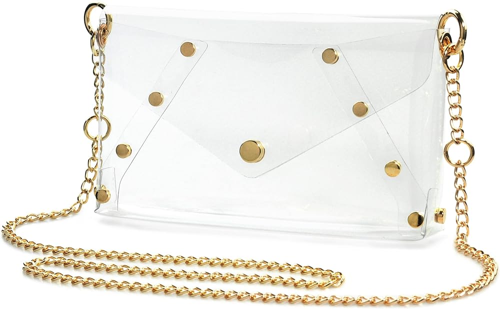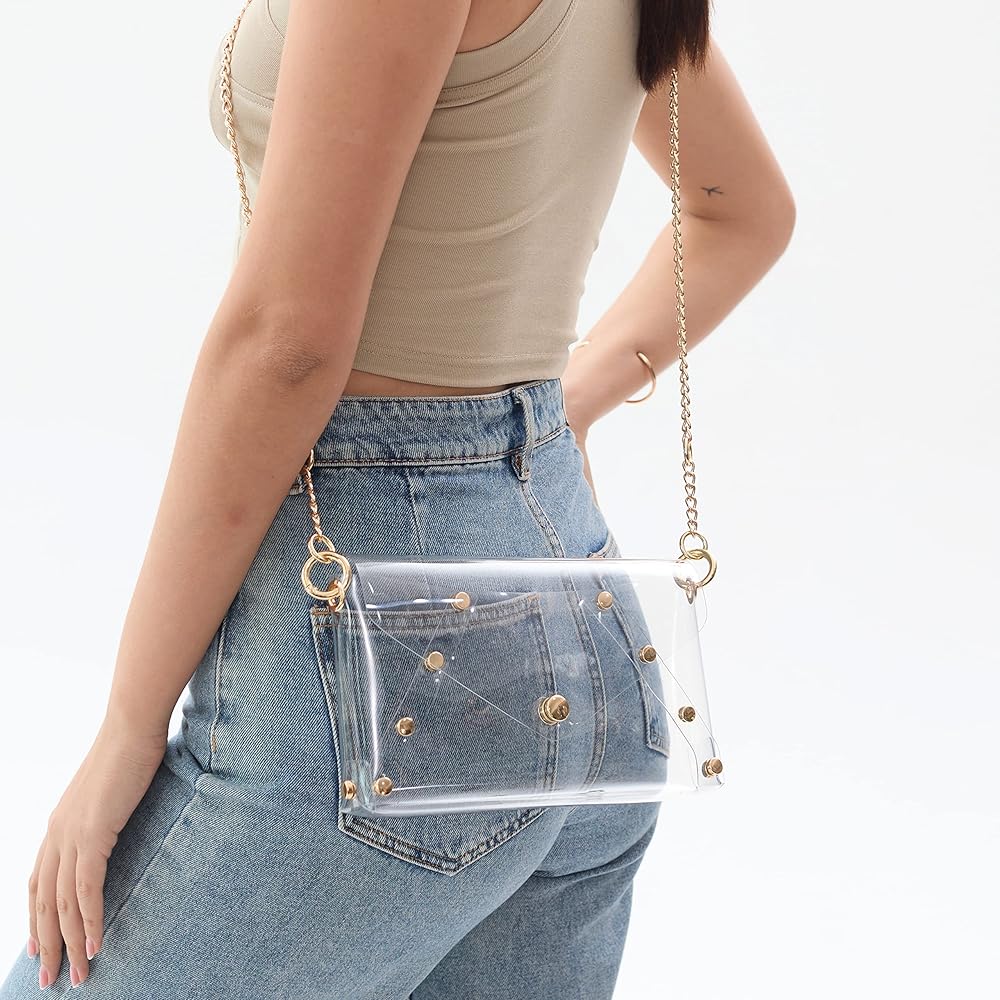 Introducing our latest, sleek envelope-style clear shoulder bag, which makes a bold statement with its slim profile and rivet studded metal accent for added modern.