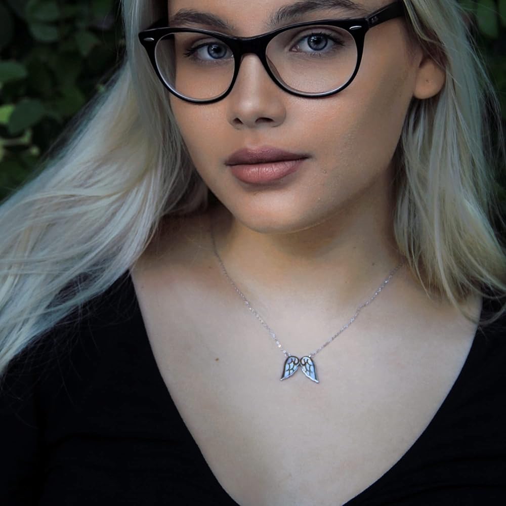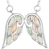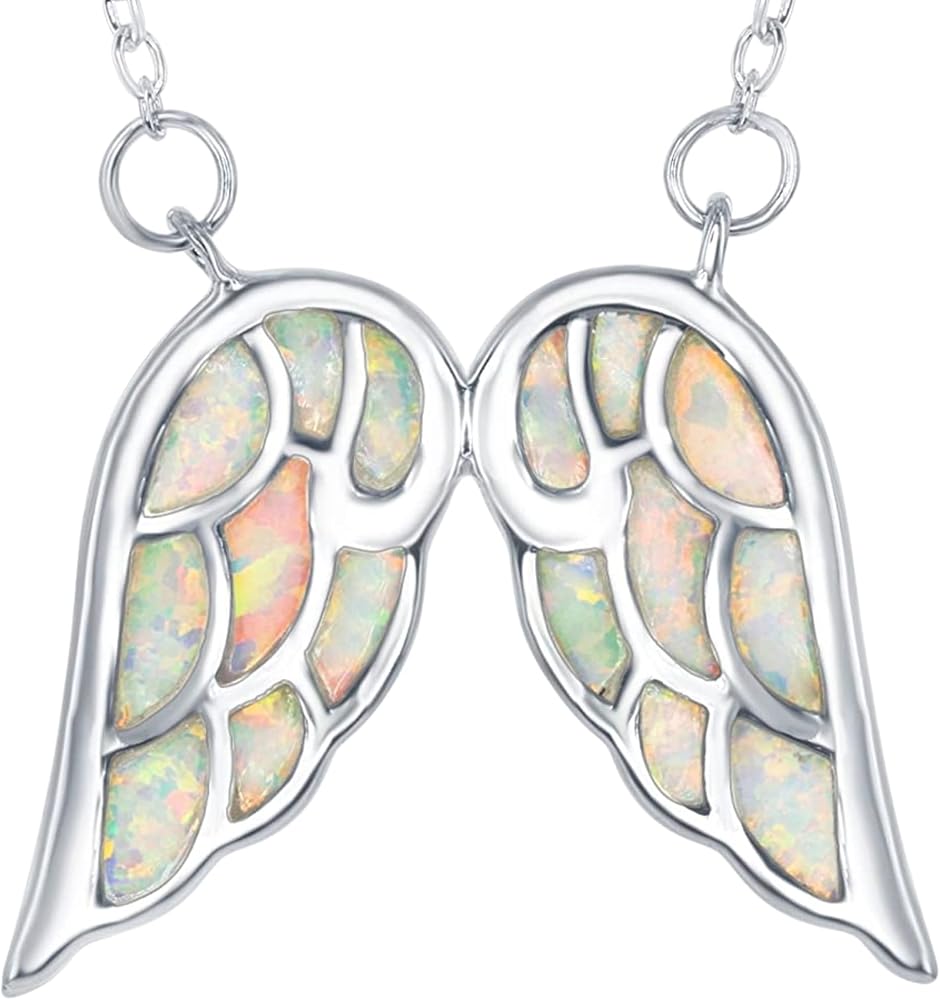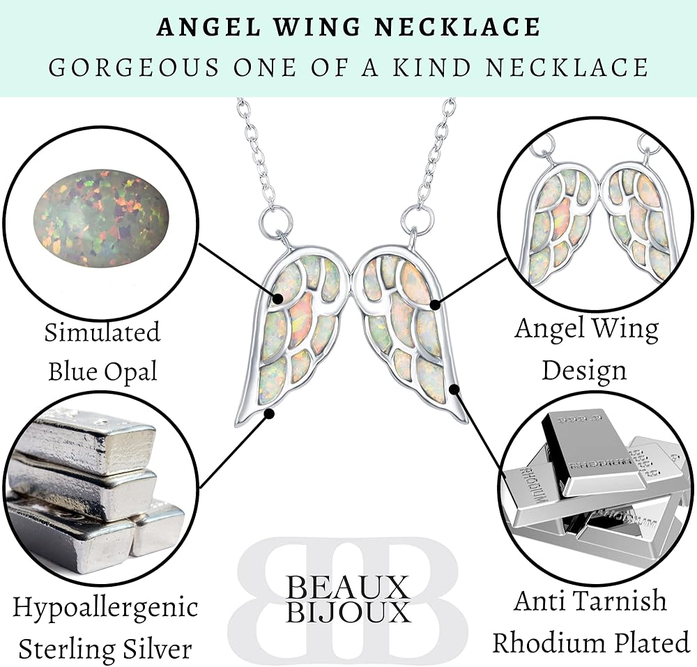 Gorgeous women's angel jewelry crafted of sterling silver and a lovely simulated Opal stone. Choose your favorite style from a Heart shaped angel wings or unique dainty double angel wings necklaces. They compliment any look and style. It comes elegantly packaged with a soft beaux bijoux pouch within a lovely jewelry gift box, ensuring an impressive unwrapping experience for the lucky recipient. These fascinating, meaningful necklaces make a unique gift idea as college gifts for girls, farewell gifts, friendship gifts, going away gifts, a special gift to mark valentines day, Christmas, mother's day, birthdays, graduations, prom, or other special occasions. Add these beautiful, unique angel necklaces to her jewelry collection today.
