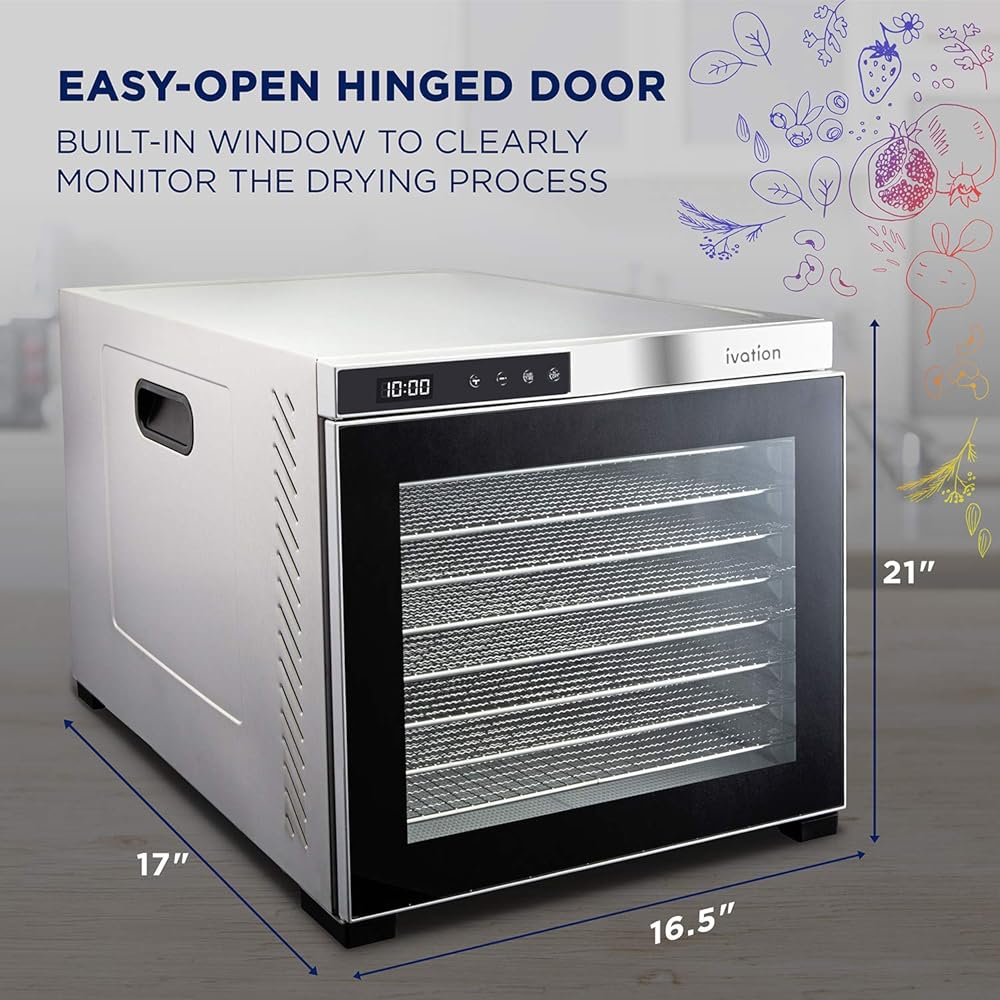 آلة تجفيف الطعام التجارية Ivation 10 صينية | 1000 واط، مؤقت رقمي قابل للتعديل والتحكم في درجة الحرارة | مجفف للأعشاب واللحوم ولحم البقر والفواكه والخضروات الجافة | الفولاذ المقاوم للصدأ