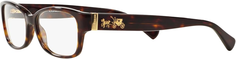 FRAME FEATURES: HC6078 eyeglass frames feature a rectangular, dark tortoise frame with classic Coach temple icon.