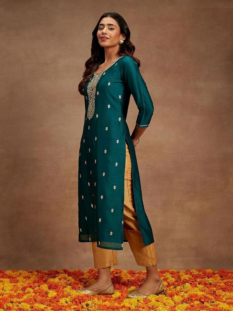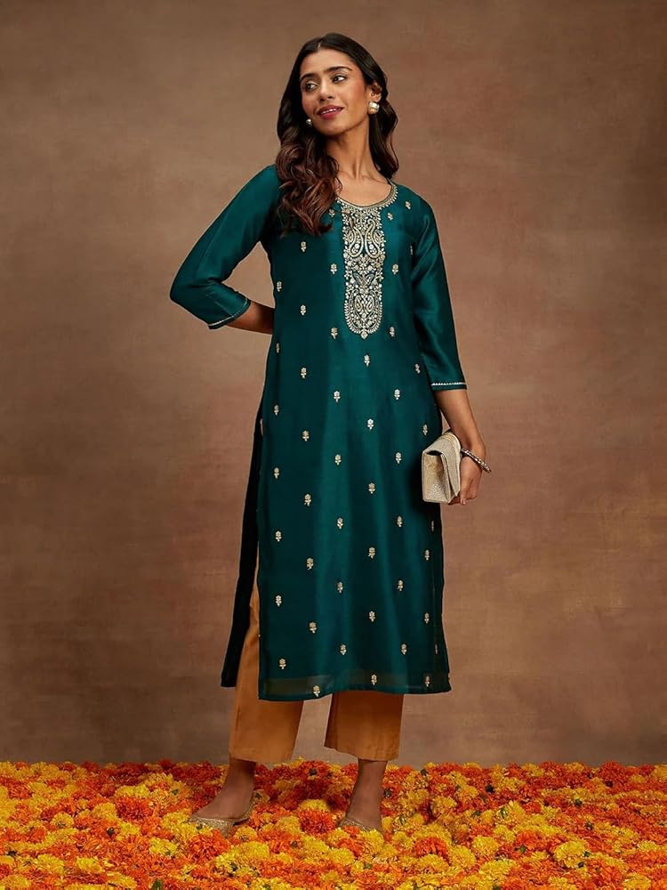 Our Silk Blend kurti boasts a timeless and versatile design. Whether you're heading to the office, attending a festive celebration, or simply going out with friends, this kurti effortlessly complements your style. Its classic silhouette ensures it never goes out of fashion, making it a valuable addition to your wardrobe.Adorned with exquisite embroidery and delicate sequin work, this kurti adds a touch of sophistication and glamour to your ensemble. The intricate detailing not only enhances its visual appeal but also showcases our commitment to quality craftsmanship.Comfort is paramount when it comes to clothing, and our Silk Blend kurti doesn't disappoint. It offers a comfortable fit that allows you to move freely and confidently throughout the day. You'll love the way it drapes elegantly, accentuating your natural grace. Available in various lengths and sizes, our kurti caters to different body types and style preferences. Pair it with your favorite bottom wear, whether it's leggings, churidars, palazzos, or jeans, for a complete and trendy look. The options are limitless.
