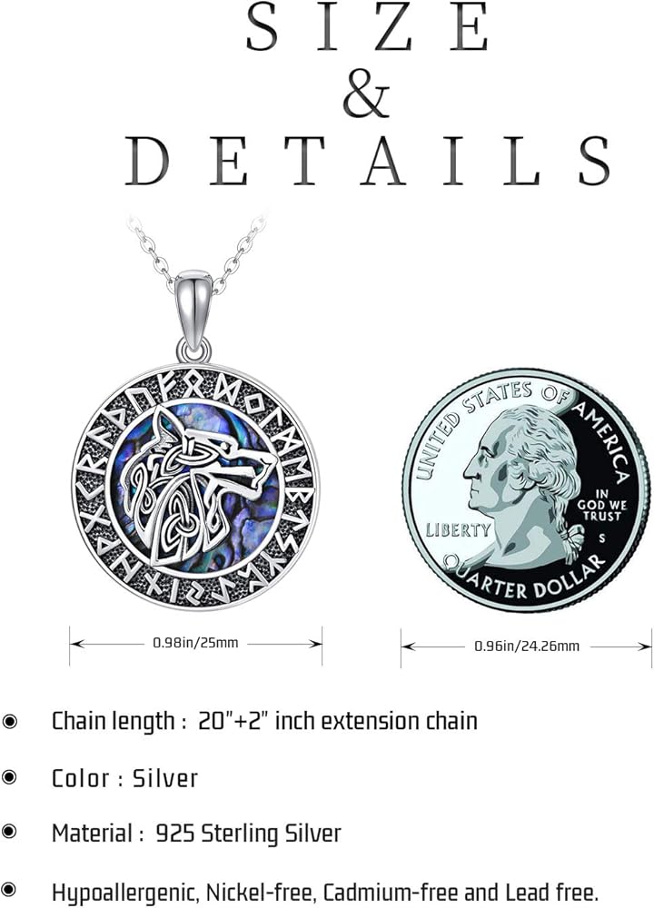 المواد: قلادة الذئب مصنوعة من الفضة الإسترلينية النقية، عملية أكسدة رائعة تجعلها كلاسيكية وعصرية. خالية من النيكل والرصاص والكادميوم ولا تسبب الحساسية. مناسبة للنساء والرجال في أي عمر.