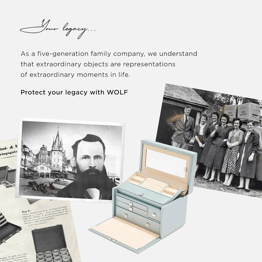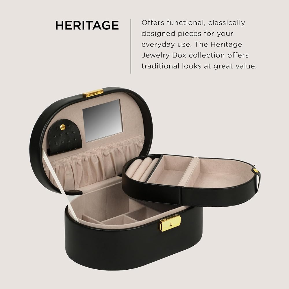تجمع مجموعة هيريتيج بين الأناقة والجودة الخالدة في سبعة أنماط مناسبة للسفر. مساحات تخزين متعددة ولفائف الخواتم وحوامل الأقراط هي طريقة رائعة لتنظيم المجوهرات القريبة والبعيدة. جزء من مجموعة هيريتيج، تتميز هذه الحافظات الأنيقة والمدمجة بجزء خارجي من الجلد وأجزاء داخلية من القطيفة بلون بيج داكن ومشبك إغلاق مطلي بالكروم أو قفل المفاتيح.