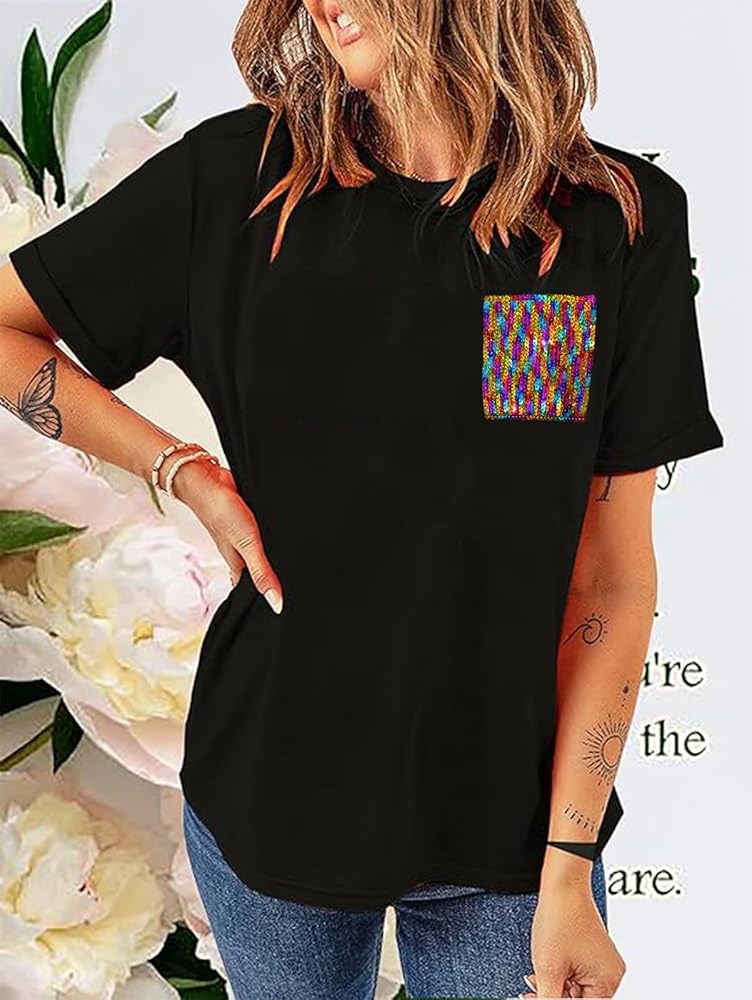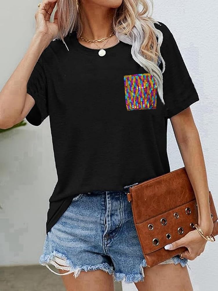 Women Sequined Splicing Short Sleeve T-Shirt,Unique Sparkling Sequin Design With Soft Fabric, It Is Very Easy To Match Clothing, Great To Wear With Pants, Skirts, Denim Shorts, Jeans, Leggings, Shorts, High Heels, Boots Etc,This Shirt Must Make You Stand out Among others,Get a lot of Compliments.