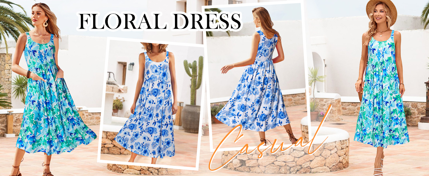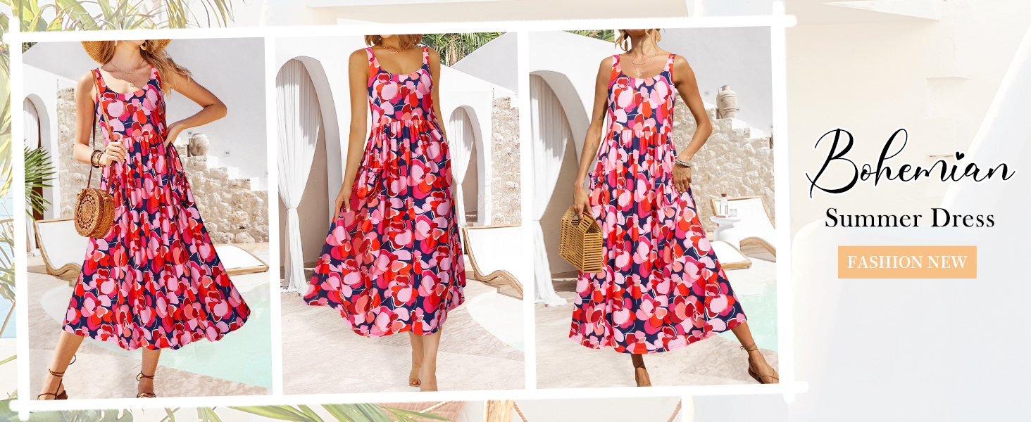 أزياء الصيف اليومية العصرية: يمكن للفساتين النسائية أن تسلط الضوء على عظمة الترقوة والكتف والرقبة المثيرة من خلال رقبة واسعة وحزام سباغيتي، سهلة الارتداء والخلع؛ يمكن للأرجوحة المتدفقة والمقاس الفضفاض أن يخفي بطنك، ويناسب معظم أشكال الجسم؛ وطول متوسط الطول وخصر مرن وجيوب لطيفة تجعل هذا الفستان الزهري أكثر أناقة