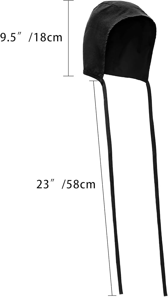 - المقاس: طول ربطة العنق 23 بوصة/59 سم، وتُستخدم الأشرطة للربط أسفل الذقن ومقاس واحد يناسب معظم الأشخاص بمحيط الرأس 45 سم - 58 سم.