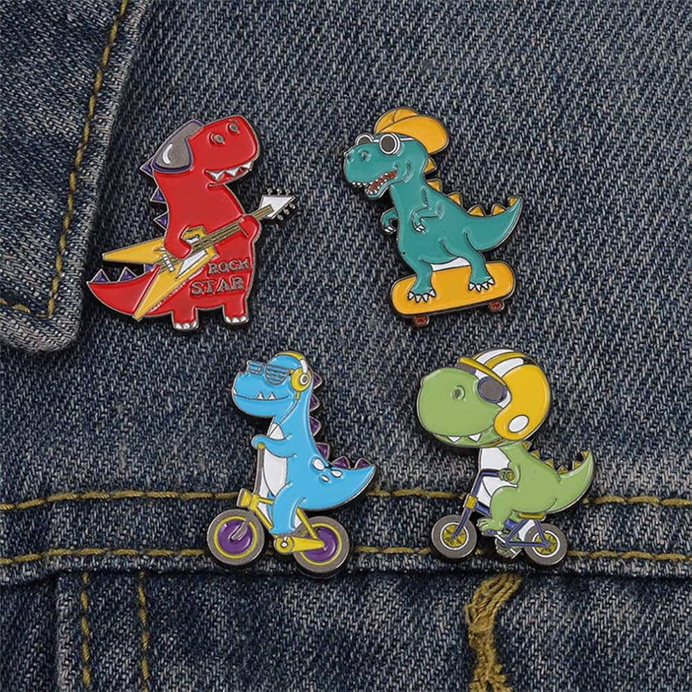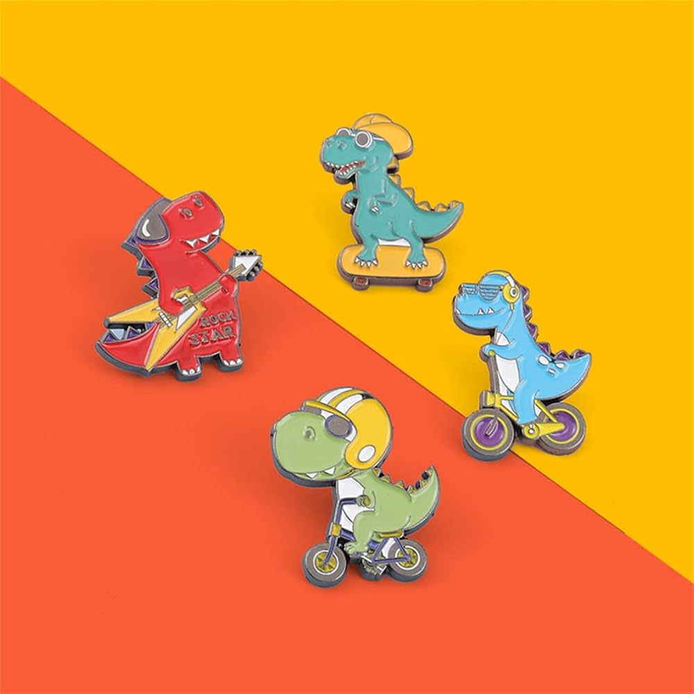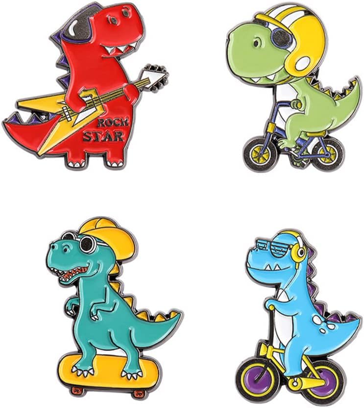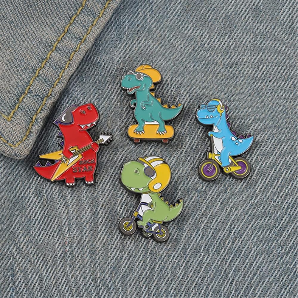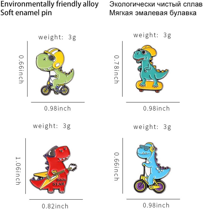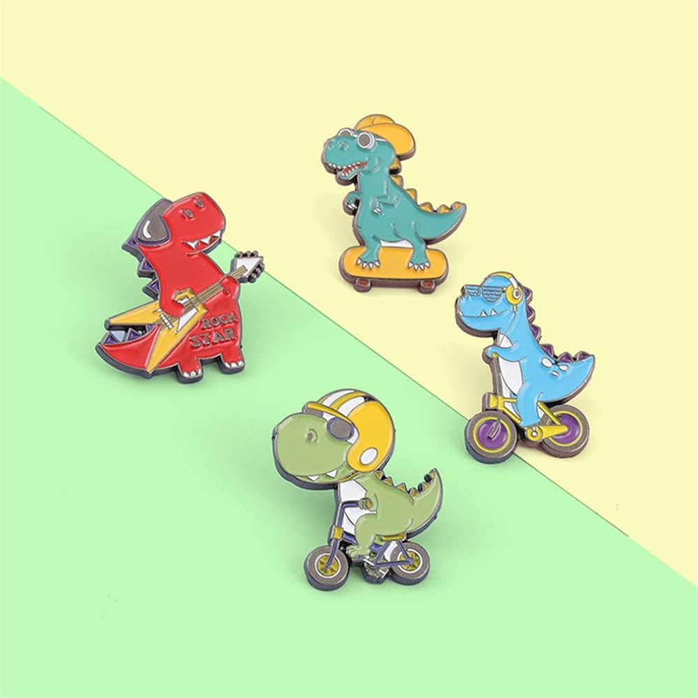 4 قطع من بروش سلسلة الديناصورات الكرتونية ولوح التزلج والدراجة والجيتار على شكل ديناصور، دبوس مطلي بالمينا على شكل حيوان لطيف، بروش للقبعة والجاكيت والقميص والتنورة والحقيبة القماشية