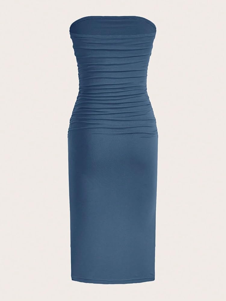 • Features: strapless, split thigh, sleeveless, ruched detail, midi length, solid color