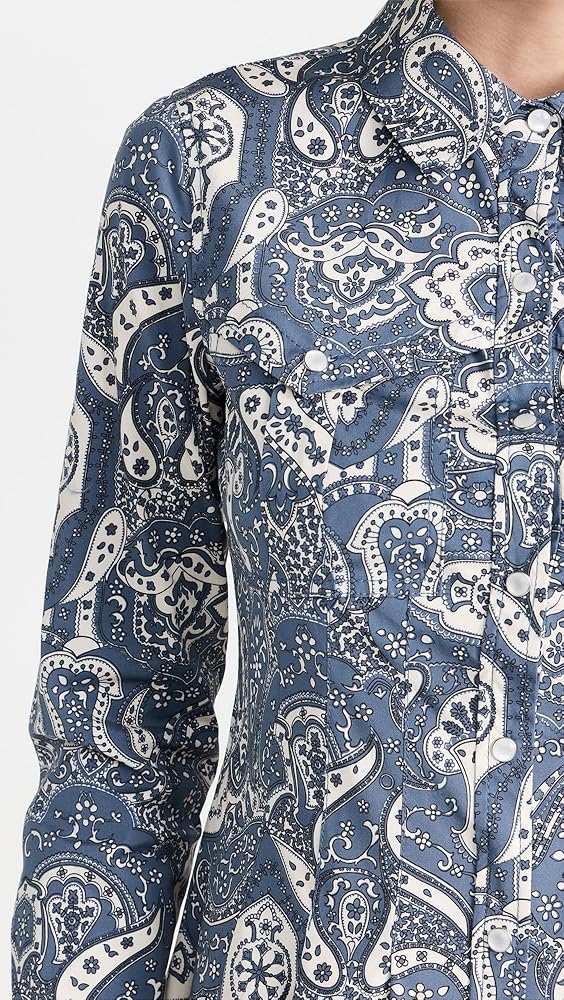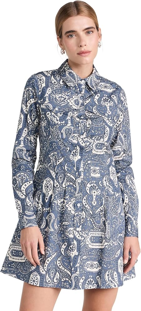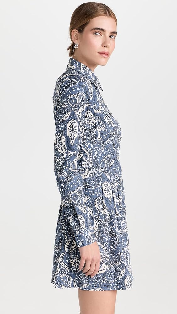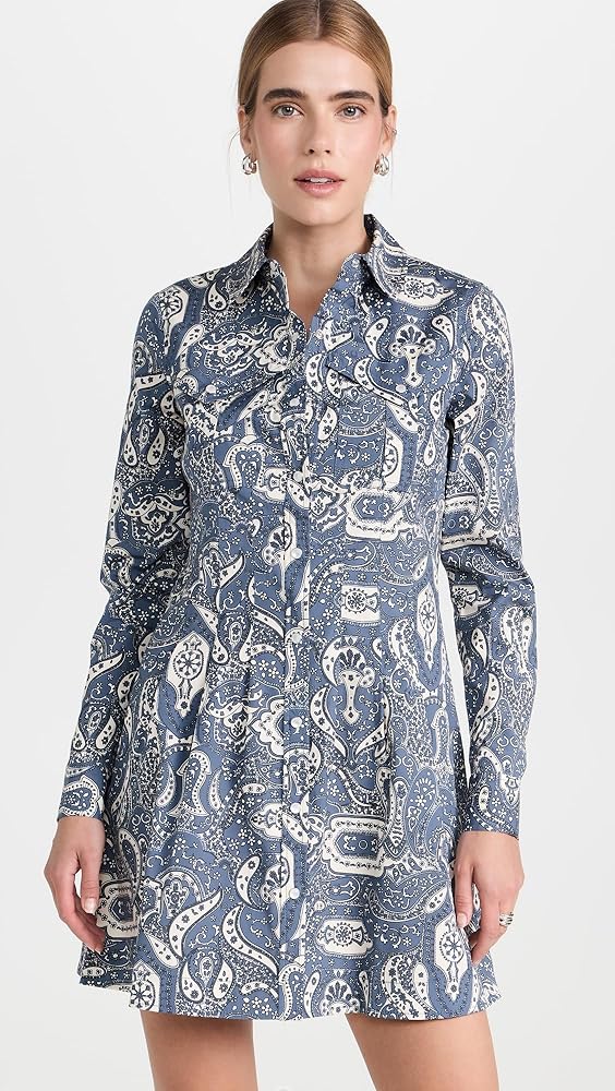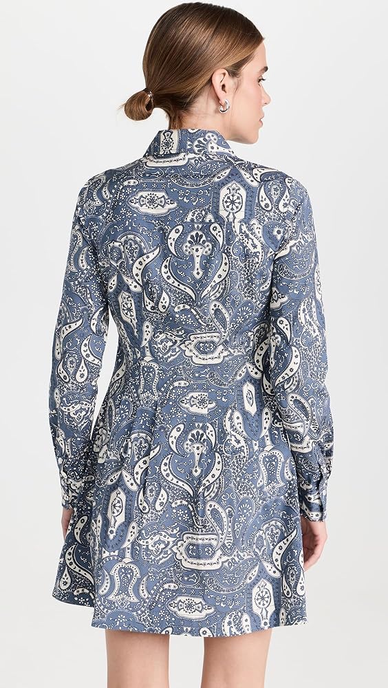 • رقبة بياقة وفتحة أزرار، أكمام طويلة مع أساور بأزرار، تنورة مطوية، طباعة بيزلي، إغلاق بسحاب مخفي أسفل الخصر قليلاً