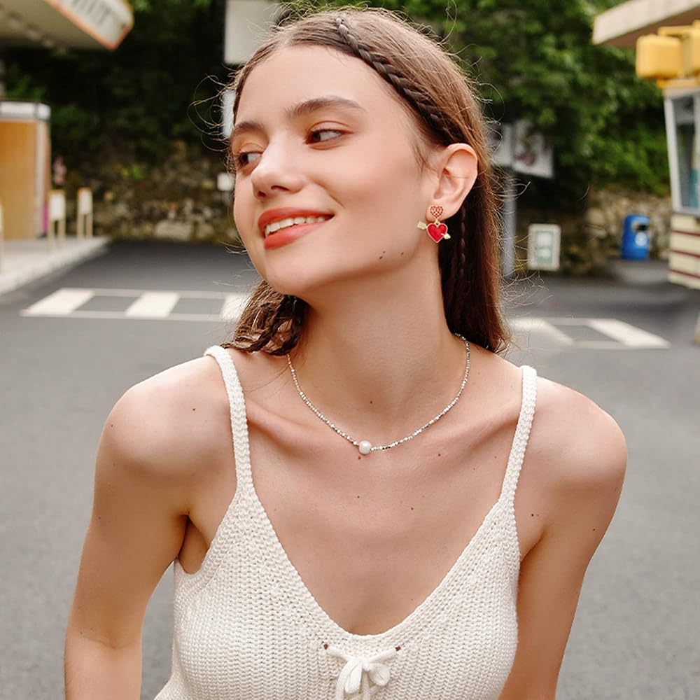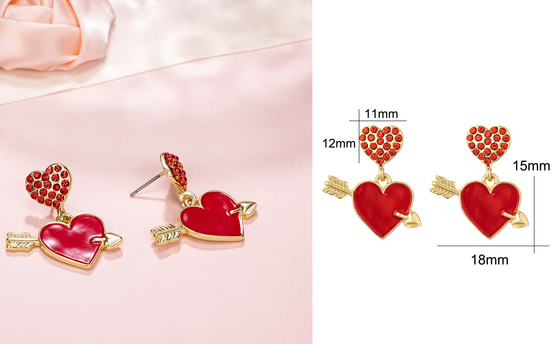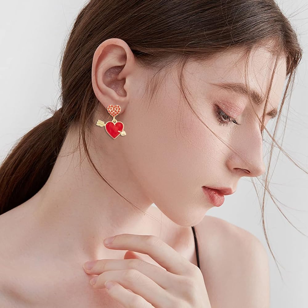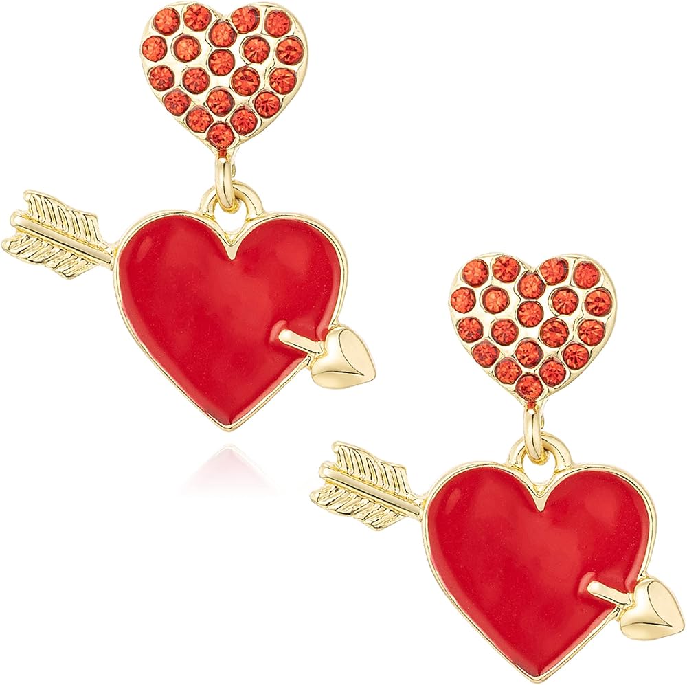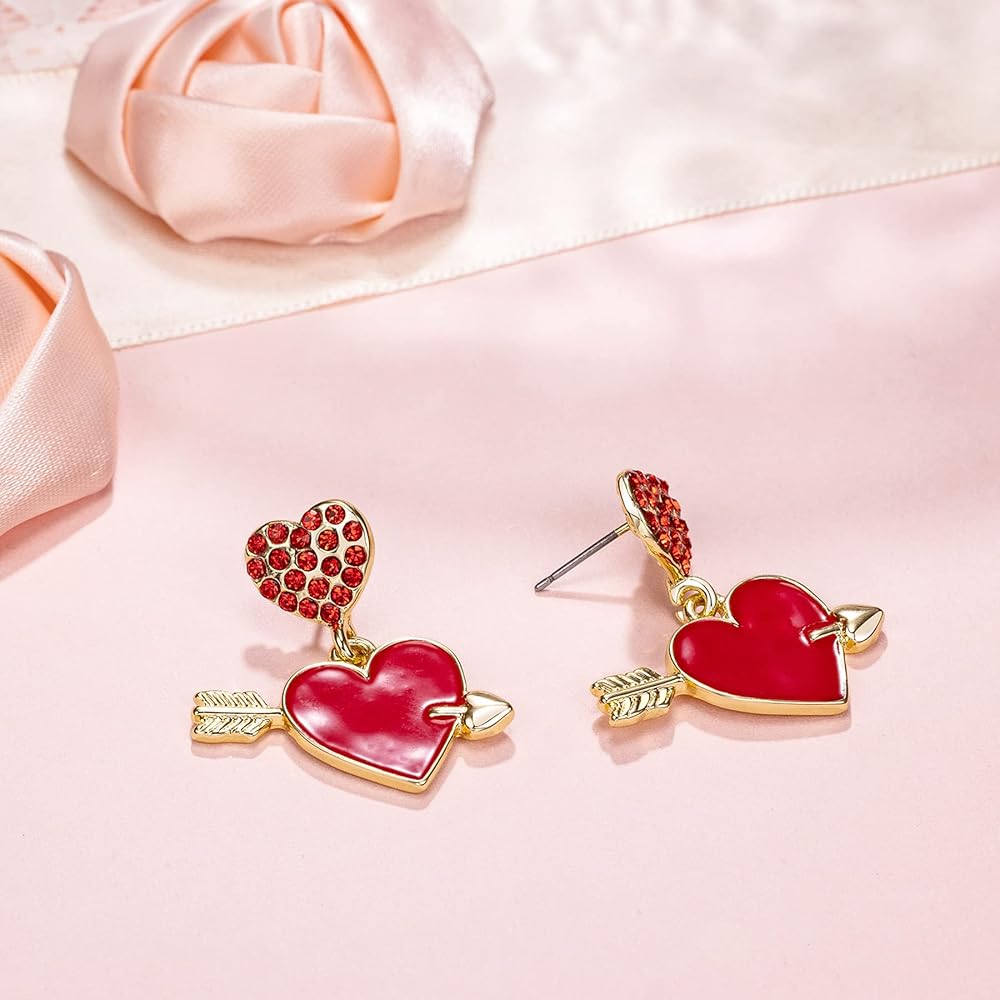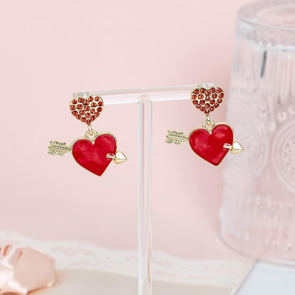اقراط على شكل سهم على شكل قلب، اقراط على شكل قلب مطلية بالمينا الحمراء مع سهم، مجوهرات قلب من الزركونيا المكعبة لعيد الحب، هدية عيد ميلاد للنساء، مقاس M، زنك، مكعب زركونيا